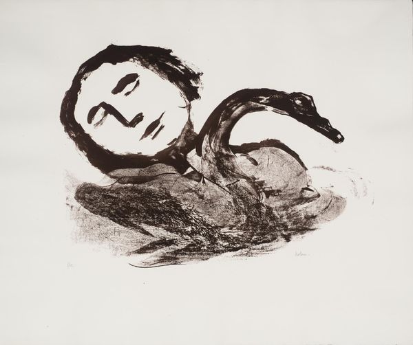 Editor: Richard Diebenkorn's 1962 monoprint "Sleeping Girl" renders a nude figure in deep repose, primarily in graphite and ink on paper. I'm struck by the raw quality of the mark-making; you can really sense the artist's hand and the directness of the process. How does this materiality shape our understanding of the piece? Curator: The choice of monoprint is key. This wasn’t about mass production, but about a unique, almost ephemeral trace. It points us to the labor involved, the pressure, the pulling of ink, revealing process as intrinsic to the image. The texture, isn’t it interesting how it challenges any easy notion of idealized beauty? Editor: It really does! There's nothing refined or idealized here, only this physicality you're talking about. Does that have implications beyond just aesthetics? Curator: Absolutely. Diebenkorn worked during a time of shifting social values and the questioning of traditional representation. By emphasizing the material act of creation and rejecting smooth perfection, this monoprint could be seen as a subtle commentary on the commodification of the body and the art market. He is not producing another object of desire. Editor: So, the inherent nature of the printmaking itself rejects that notion of "high art" in favor of highlighting the working class labour? Curator: Precisely! The choice of monoprint subverts notions of luxury, drawing our attention instead to the grit and toil of its making. What do you make of the darkness surrounding the figure? Editor: I'm seeing that as related, this suppression into the background that is only made visible through the materials used to represent her, but there is so much negative space still in the image... Is this just an effect of the printing process or something more intentional? Curator: Could it symbolize the limitations and repressions placed on women's bodies at the time? What does this materiality "do," so to speak, in conversation with cultural concerns? Editor: This has definitely given me a fresh perspective on how material choices can carry social meaning. The imperfections become incredibly expressive. Curator: Yes, we’re not just seeing a sleeping figure, we are engaging with a material record of social making, one that has made me appreciate it even more.