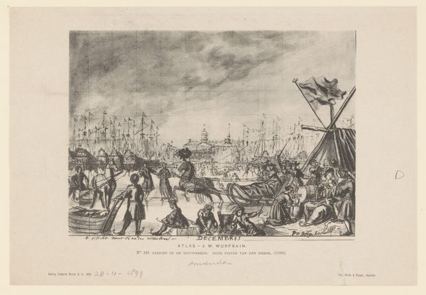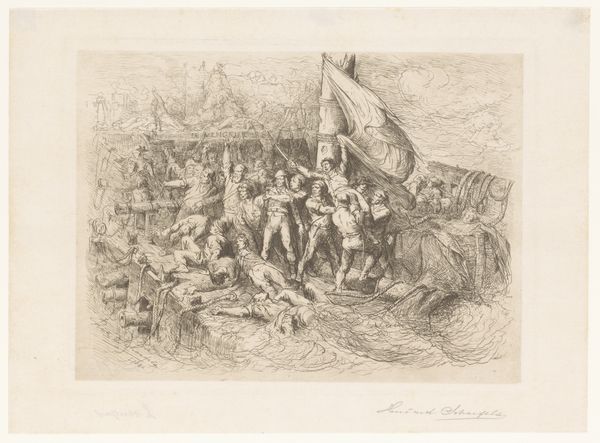 Editor: This is "Scheepsbemanning dobbelt op het dek van een schip," or "Ship's Crew Gambling on the Deck of a Ship," created in 1848 by Henri François Schaefels. It's an engraving showing a group of sailors engrossed in a dice game. The scene feels… oddly relaxed, considering they’re on a ship. What strikes you most about this piece? Curator: The enduring human impulse for games of chance, for one. Look at how the artist captures the anticipation and drama inherent in their shared ritual. Gambling, like maritime life itself, becomes a metaphor for navigating uncertainty. Each toss of the dice, each voyage into the unknown. Consider, too, the larger ship as the vessel through life’s capriciousness, and the cultural memory this evokes. What kind of ship do you think it is? Editor: It looks like a warship from the 19th century, maybe? Given the uniforms and the weapons nearby. Do you think the artist is commenting on the lives of sailors? Curator: Yes, perhaps on their down time in this detailed snapshot of daily maritime life. Their faces aren't idealized, but neither are they demonized. Schaefels is not merely representing an activity but is portraying humanity seeking distraction. Think about the dog present in the scene too. The presence of an animal connects the crew to the familiar comforts of home. Where do you see parallels between then and now? Editor: That makes sense! I guess people always found ways to unwind, even in demanding circumstances. It’s easy to overlook the quiet moments like these, but they tell us a lot. Curator: Absolutely. And, thinking about those cultural symbols embedded in nautical imagery, you might recognize how these continue to appear even today. Every image tells a tale of emotional investment, wouldn’t you agree?