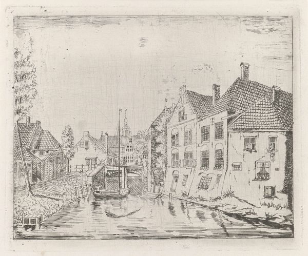 This is Willem Adrianus Grondhout's "Volendam," an etching on paper which captures a waterside scene. Immediately, one notices the stark monochrome, which lends a textural depth to the interplay of light and shadow across the image. The composition is structured around a strong horizontal axis created by the pier in the foreground. This divides the scene, above, the village of Volendam is depicted, composed of tightly packed buildings, boats and figures, all rendered with intricate detail. The buildings are depicted through a complex of lines, dots and smudges. Below, a series of boats, the surface of the water, and support beams create a sense of depth and texture. Grondhout's technique emphasises the graphic qualities of the etching process. He uses the formal devices of perspective and contrast to create a sense of depth. The etching captures the quiet, unadorned reality of Volendam. The village transcends its simple depiction to become a site of cultural meaning. As you continue, consider how Grondhout’s arrangement of form shapes the meaning in the artwork.