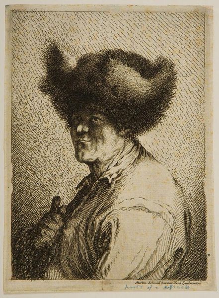 Curator: This is John Hamilton Mortimer’s, “Portrait of a Man in a Fur Cap, Three-Quarters to Right”, now held in the Tate Collections. Editor: What strikes me immediately is the intense cross-hatching, giving the figure a weighty, almost brooding presence. Curator: Mortimer was working in a period increasingly fascinated with individual character and the rise of portraiture as a status symbol. The fur cap itself speaks to notions of rustic virtue. Editor: It’s also a symbol of warmth and protection, isn't it? Fur speaks to a primal connection with nature and survival. The man’s gaze seems almost defiant, yet vulnerable. Curator: Yes, and during this time, there was growing interest in physiognomy, the belief that one’s character could be read in their features. Editor: Fascinating how an artist captures not only likeness but also prevailing cultural beliefs of an era. Curator: Indeed, it gives us a glimpse into the socio-cultural landscape of 18th-century England.