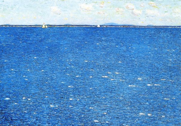 Curator: Well, isn't that calming? Like a memory half-forgotten. Editor: Indeed. What we have here is Gustav Klimt’s "Attersee," painted around 1900. An oil painting, naturally, showcasing his explorations into landscape, moving, as you can clearly discern, toward modernism. Curator: It's more than landscape, though, right? It’s that dazzling teal! It almost vibrates, the way the colors reflect, pulling me right into the surface. It reminds me of being a kid, peering into a swimming pool. Editor: The surface tension is definitely key. Look at how Klimt breaks down the visual field. He is not trying to perfectly recreate Attersee Lake but instead focuses on capturing the play of light and the sensation of being near the water. The rhythmic application of paint draws heavily from pointillism and emphasizes the optical experience. Curator: So less about what's there, and more about how we feel being there? The blurry shoreline...almost a dream-like quality. I think that resonates, given when he painted it. Pre-war Europe, full of both excitement and dread. It feels like looking into a beautiful void. Editor: Precisely. Art Nouveau was obsessed with surface decoration and formal elements. I feel the looming presence of symbolism lurking within. That water might mirror more than just light; it reflects a world on the verge. Curator: Oh, I can see that. It makes me want to dive right in, anxieties and all. Thanks for the insight; it really brings a new perspective to the way I interpret its surface. Editor: My pleasure. Analyzing its stylistic context allowed us to navigate the liminal space between beauty and premonition within this gorgeous work.