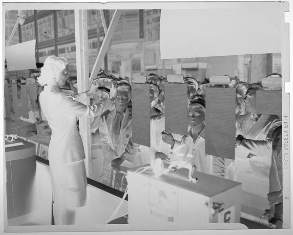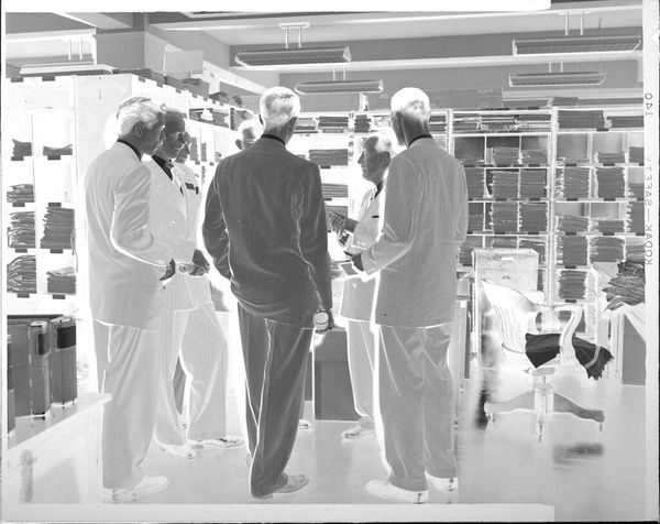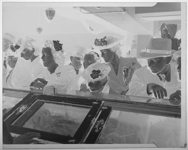 Curator: This is an untitled photograph by Martin Schweig, housed here at the Harvard Art Museums. It depicts eight men inside what appears to be a beer brewing plant. Editor: It's striking! The men are sharply dressed, but the setting – that industrial space – creates an interesting tension between labor and leisure. Curator: Precisely. Schweig captures this moment of respite, likely during or after a workday. The act of drinking here signifies a break from the production process. Editor: I'm drawn to the materiality of it. The contrast emphasizes the men’s suits against the cold metal and machinery; it suggests the importance of the social rituals linked to the beer making. Curator: And the photograph itself becomes a document of a specific cultural moment, showing how labor was celebrated or endured. Editor: It makes you think about the workers' lives, their labor, and the social dynamics within this industrial setting. Curator: Indeed. Schweig offers us a glimpse into the socio-political framework of this factory, if only for a brief moment.
