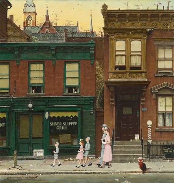 Curator: Vincent Giarrano's oil painting captures a vignette titled "Stone Street," offering a contemporary take on urban life. Editor: It projects a sense of quiet observation. The composition feels both staged and spontaneous, drawing my attention to the interplay of color, specifically how the greens contrast against the brick. Curator: It is tempting to interpret Giarrano's paintings through a semiotic lens; we might consider the repetition of architectural forms—the doors, windows, and brickwork—as symbolic of societal structures, with individuals navigating these prescribed spaces. Editor: I see the individual situated within specific societal constructs. We see not only a candid moment of city life but also its economic implications as a street designed to provide services through local storefronts. How might local zoning ordinances have influenced this specific development of space, and what do building material choices imply about available resources and capital? Curator: The use of light plays a vital role, too. It bathes the façade in a warm glow, but shadows add depth, especially casting light on the solitary woman's figure, accentuating her isolation amidst the city's hustle. There's a certain emotional complexity present here. Editor: This area represents layers of transformation over time. As a street art rendering it further becomes an object of study as to who inhabits or interacts with this locale today, and how has the street been utilized since its early days. Is the rendering meant to capture it frozen in time, or in a period of revival or abandonment? The artwork becomes both documentation and archive. Curator: His precision makes the familiar somehow surreal. "Stone Street," it seems, urges us to decode our surroundings, finding both beauty and order in urban chaos. Editor: Ultimately, the painting underscores the pedestrian experience within complex social landscapes, revealing much more about public and personal history.