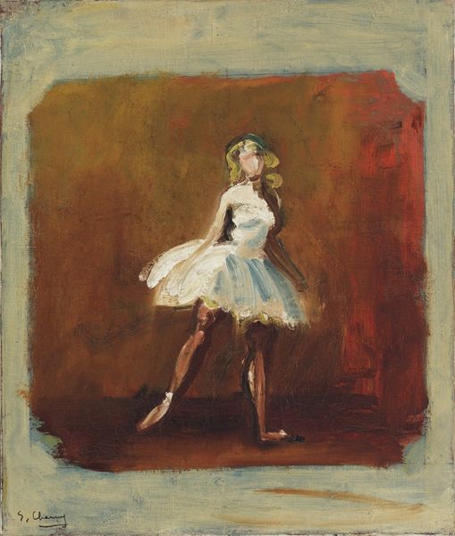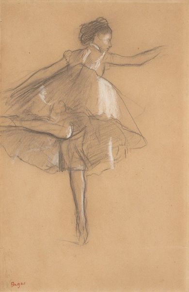 Curator: The delicate lines and muted palette give "Study of a Ballet Dancer" a rather melancholic air, don’t you think? It is from around 1873. Editor: Indeed. At first glance, the work's structural foundation rests on a compelling contrast: the dense charcoal strokes defining the dancer’s torso, juxtaposed against the ethereal lightness achieved in the depiction of her tutu. It’s Degas's mastery of line and form that first commands my attention. Curator: For me, ballet dancers are figures deeply embedded within our cultural psyche. Consider how ballet, once a symbol of aristocratic refinement, transitioned into a more accessible, though still highly disciplined, art form. Degas captured this shift, but I think this dancer evokes more than just grace. Editor: I am struck by how the use of pastel to accent certain areas highlights a careful articulation of depth and volume. Note also how the composition guides our eye; it begins at the weight-bearing foot that descends almost beyond the border of the paper. Curator: The recurring motif of ballet dancers in his oeuvre suggests a deeper fascination with their world, beyond the stage. Perhaps the dancer serves as a metaphor for beauty and dedication, or possibly something about fleeting moments captured. There is an air of loneliness about her pose, too. Editor: Agreed, and the figure-ground relationship plays a critical role. The subtle tint of the paper infuses the scene with a gentle warmth that softens what might otherwise be severe. This compositional choice lends the work an understated elegance, almost dissolving in the surrounding void. Curator: Seeing her drawn with what seems like a frenetic energy makes me think of the dedication of those young girls. What looks graceful took them many exhausting hours to get there. In our current society, her image reflects ideas about beauty standards and performance anxieties. Editor: Indeed. The way Degas renders the dancer's form encapsulates so many complex interactions and relations, both formal and symbolic. Curator: This piece provides such rich insight. Editor: It's Degas's unique sensibility at play, offering endless interpretative potential for anyone seeking to analyze the complex world captured in a few pastel strokes.