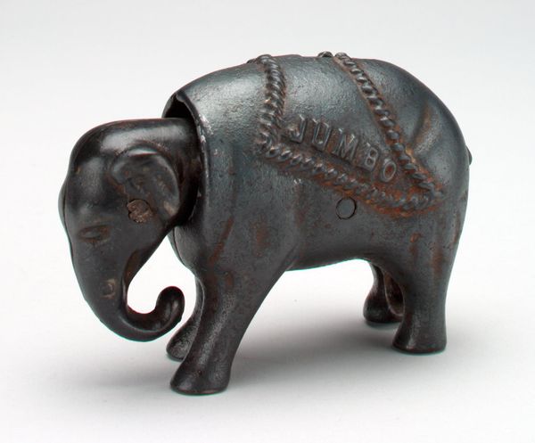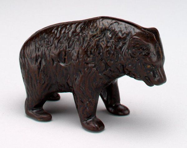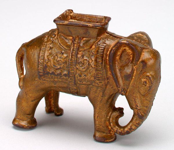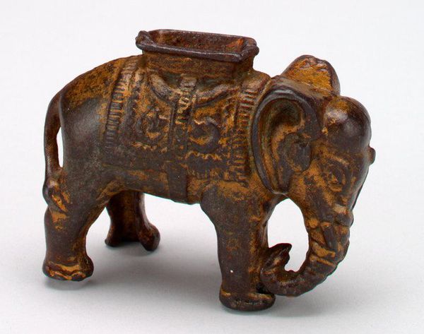 Editor: This adorable “Elephant with Tucked Trunk” still bank, probably dating between 1910 and 1932, made by Arcade Manufacturing Company, strikes me with its simple beauty and almost abstract, sculptural form. What are your thoughts on the material presence and shape? Curator: The craftsmanship here highlights the material properties, wouldn't you agree? Observe how the metal has been molded, imbuing a sense of weight and permanence despite its modest scale. Note how the bronze coloring accentuates the simplified contours and the animal's overall form. It’s less about faithful representation, and more about exploring geometric volumes and textures. What purpose do you believe the artist intended the textures serve in the bank's overall structure? Editor: I hadn’t considered texture beyond visual appeal. Now that you mention it, the varying shades and textures play with light, drawing the eye along the curve of the back and down the legs, reinforcing the elephant's stance and making it appear more substantial. It’s quite clever. Curator: Indeed. Consider, too, the placement and treatment of its trunk. Tucked away, almost shyly, yet its shape—a tight spiral—creates visual tension with the solid bulk of the body. Do you find a particular appeal to such artistic decisions? Editor: Yes, I am beginning to understand a deep connection between surface and intention and material, the way an ordinary item such as a child’s coin bank transcends its usefulness. Thank you. Curator: You're welcome. The simplicity and subtle manipulation of material form combine to produce a remarkably engaging piece.