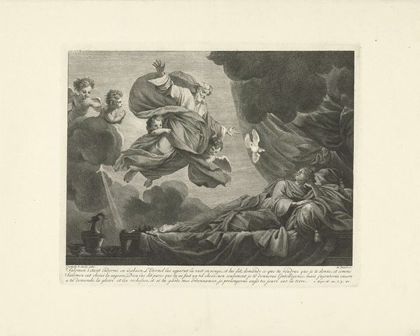 Editor: This engraving, "Hemelvaart," or "Ascension," created in 1748 by Jan Punt and currently at the Rijksmuseum, features the ascending figure of Jesus surrounded by angels. The monochrome palette lends it a solemn air. What cultural and historical context shapes your interpretation of this print? Curator: The Ascension as a subject was central to asserting religious doctrine in the 18th century. Think about the power structures: religious institutions wielded significant influence, and art like this, disseminated through prints, reinforced that influence, literally elevating spiritual authority. The Baroque style, with its drama and emotional appeal, also served a purpose, engaging viewers and promoting piety. Editor: That makes sense. It's interesting to consider how art was a tool for these institutions. I had primarily focused on the artistic merit and emotion, how does that intersect with the politics of imagery at the time? Curator: It's a useful contrast! The emotionality inherent in the work also functions politically, directing public sentiment. What appears devotional might also operate as subtle social conditioning. Consider how many could engage with art on these themes versus directly understanding religious or political lectures. Editor: So, art could bypass the more intellectual parts of the message and deliver an emotive experience for faith and power? Did such artistic and political motivations shift over time? Curator: Absolutely! Examining the shift from overtly religious subjects to secular narratives allows a comparison on which themes were considered important by different ruling or cultural influences, even if the artistic style itself didn’t drastically change. Considering an artist’s public persona is crucial to this. Editor: This reframes the image for me; it goes beyond personal faith. I understand that it provides unique insight into religious and cultural values of the time. Thank you! Curator: My pleasure, it is important to view the work as a cultural artifact as much as art.