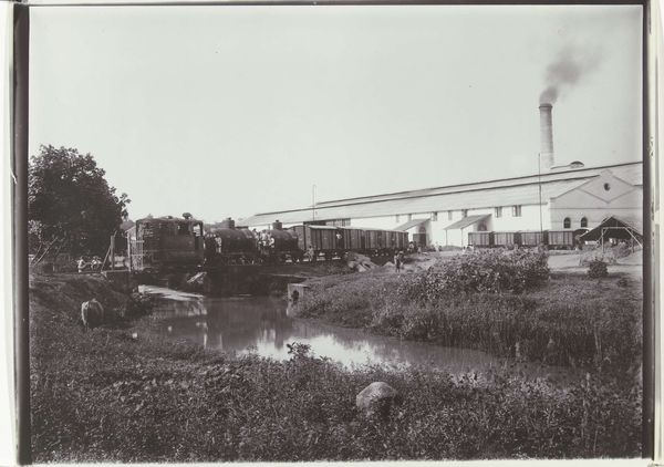 Curator: This photogravure captures the Suikerfabriek Tjomal, a sugar factory, sometime in the early 1900s to 1910s. The anonymous photographer immortalized this scene in what is now present-day Indonesia, and it’s held here at the Rijksmuseum. Editor: Immediately, the factory’s architecture juxtaposed with the surrounding landscape speaks of both progress and exploitation, there's such an air of… potential energy bound up with colonial power. The monochrome flattens everything, heightening this almost spectral quality. Curator: Precisely! It's critical to understand how these industrial structures became symbols of colonial enterprise. The image encapsulates the extraction of resources and labor in former Dutch East Indies. Note how the chimney dominates the skyline—a clear signal of control, similar to church spires elsewhere. Editor: The repetitive geometric patterns in the buildings themselves suggest a rational, almost sterile imposition onto the organic landscape. Even the smokestack resembles an inverted obelisk – power turned to production, though also hinting at a loss of nature, something mourned. Curator: It's intriguing that you view it in that mournful context. I read the symbolism of the chimney somewhat differently – less about loss, and more as assertive and domineering given what it produces and provides for external economies. I’d suggest focusing on those workers at the edge of the covered loading areas – their labor visually fueling the machinery and system. Editor: And doesn't the photographer's perspective add another layer of meaning? Taken from a slightly elevated vantage point, it perhaps reflects the assumed authority over the scene. You're absolutely right to mention labor's symbolic value here – but where does that symbolism take us? Curator: Back to the idea of progress and its ambiguous consequences. The factory not only becomes a testament to technological advancements, but a cultural object signifying economic dependency and subjugation of the workers through the era’s political regime. The aestheticization of industrialization conveniently omits details. Editor: Precisely, it's an image designed for a specific audience and ideological perspective, which demands critical engagement when considered in our present context. This print holds cultural memory for many outside the colonial gaze. Curator: An incredibly rich reminder of the layered and complex histories embedded within seemingly straightforward realism, I agree. Editor: Agreed, what lingers now are profound questions around agency, visibility and a somber consideration of "progress."