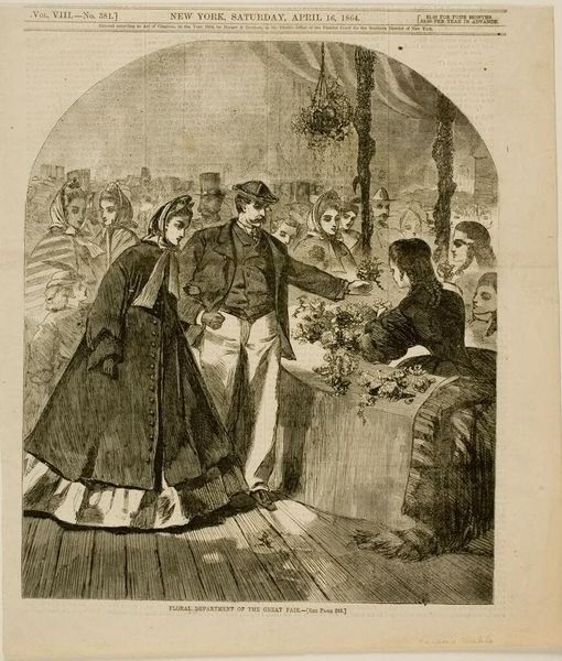 Editor: This is Winslow Homer’s "Floral Department of the Great Fair," from 1864, a wood engraving plucked right from the pages of Harper's Weekly. It’s incredible how much detail he manages to capture. The overall feel is busy but somehow… controlled? What exactly was Harper’s Weekly trying to convey here? Curator: It’s crucial to remember that Harper's Weekly, subtitled "A Journal of Civilization," saw itself as both a mirror and a maker of public opinion during a deeply divisive time. This image, appearing in April of 1864, is less about floral arrangements and more about constructing an image of Northern unity and prosperity, even amidst the Civil War. Notice the well-dressed figures, suggesting economic stability, and the very public, almost performative act of displaying and purchasing flowers. Editor: So it's not just about pretty flowers, it’s about projecting an image? Curator: Exactly. Consider the "Great Fair" itself. Often these were Sanitary Fairs, fundraising events to support the Union Army and the United States Sanitary Commission, a private relief agency that supported sick and wounded soldiers. This image serves as visual propaganda, promoting a vision of normalcy and national cohesion. The choice of a wood engraving, readily reproduced and widely disseminated, was key to reaching a broad audience. Ask yourself: what kind of social and cultural work is this image meant to perform? Editor: It’s fascinating to think of this as a carefully crafted message, rather than just a simple depiction of an event. I hadn’t considered the political dimension so explicitly. Curator: And that, perhaps, is the most telling bloom in Homer's "Floral Department." By considering art as part of social and political exchange, we unlock new ways to understand what we’re actually seeing. Editor: I’ll definitely be keeping an eye out for those "hidden" messages now! Thanks for opening my eyes.