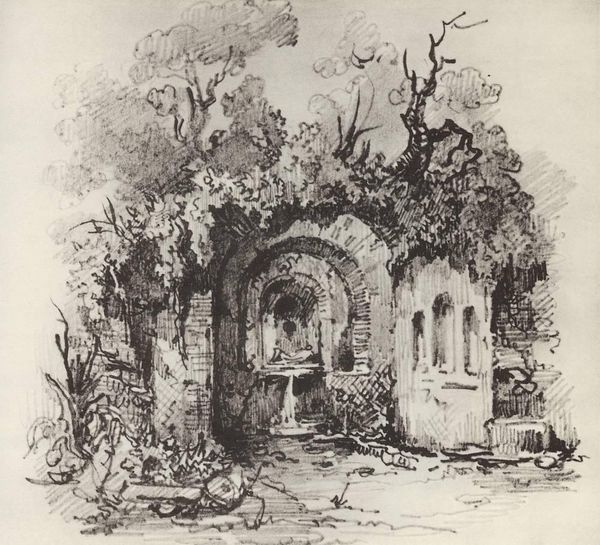 Curator: James Duffield Harding's print, "The Temple of Diana at Nismes," presents a classical structure in a state of graceful decay. Editor: My initial impression is of a somber scene. The contrast between light and shadow, particularly around the archway, creates a sense of melancholy and the passage of time. Curator: The ruined temple resonates with the myth of Diana, goddess of the hunt and the moon, whose sacred spaces were often wild and untamed. The overgrowth hints at nature reclaiming what was once ordered. Editor: Precisely. Note how the vertical thrust of the columns is echoed by the more organic, diagonal lines of the fallen debris and vegetation. It visually communicates that tension between order and chaos. Curator: The figure entering the temple seems to be searching, perhaps for the vestiges of the goddess or simply seeking a connection to the past. This invokes the enduring human need to find meaning in ancient sites. Editor: The textures achieved through Harding's lithographic technique also warrant attention. The roughness of the stone, the delicate rendering of foliage – they all contribute to the artwork's emotional weight. Curator: It is compelling to consider how this image of ruin taps into the Roman concept of "genius loci" - the protective spirit of a place whose power endures even as its physical form declines. Editor: It is a carefully constructed composition that draws the eye into the heart of the temple, inviting contemplation on history and the transient nature of human endeavor. Curator: This artwork really evokes a sense of longing. Editor: A sentiment it expresses through its evocative visual language.