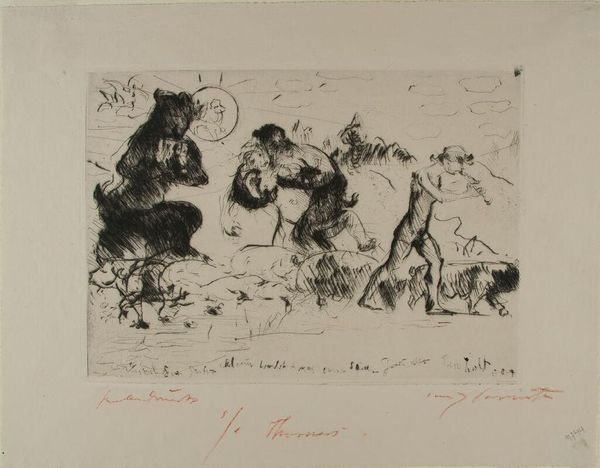 Curator: This is "Saters, een nimf, een faun en een toom varkens," which translates to "Satyrs, a Nymph, a Faun, and a Troop of Pigs," created in 1923 by Lovis Corinth. Editor: Well, the pigs are certainly present! What a wild, frenetic sketch. It feels less like a carefully considered composition and more like a fever dream captured in ink. Curator: Corinth's work frequently engages with mythological subjects, drawing on classical imagery but infusing it with a very modern, expressionistic sensibility. Think about the traditional role of satyrs and nymphs – figures embodying primal urges and connection to nature – but visualized through a lens of psychological turmoil. Editor: Absolutely. And look at how quickly the pen moved across the page; it is gestural and raw. I’m curious about Corinth's process. Was this a preliminary study for something larger? Or perhaps an end in itself, exploring the material properties of ink and paper? The cross-hatching creates so much textural depth. Curator: Given Corinth's history with etching, the lines evoke the same spontaneous quality found on those plates, yet in a more immediate manner through pen on paper. Notice how the solidity of the satyr on the left is juxtaposed against the swirling, more amorphous embrace in the center of the piece, the bodies almost melt together, driven by lust and desire. It mirrors Corinth’s own physical decline. Editor: Good point. You really feel the push and pull of that interaction in the density of the marks, where the ink almost pools on the page. I keep coming back to those pigs, though. Are they symbols of something specific, or just present, rooting about, unaware of the mythical drama unfolding above them? Curator: They serve, in a way, as a grounding element. Pigs, traditionally associated with base instincts and earthly pleasures, provide a contrast and underscore the themes already presented. They highlight the messy, chaotic nature of desire that these mythical figures embody. Editor: Seeing Corinth wrestling with classical tropes through the lens of material experimentation…it makes me rethink these figures, away from the formal perfection we usually associate with them and into something altogether more human and vulnerable. Curator: A fitting consideration as we end our visit with Corinth’s vision. It's easy to feel you are transported into the mythical past and the artist’s modern mind at once.