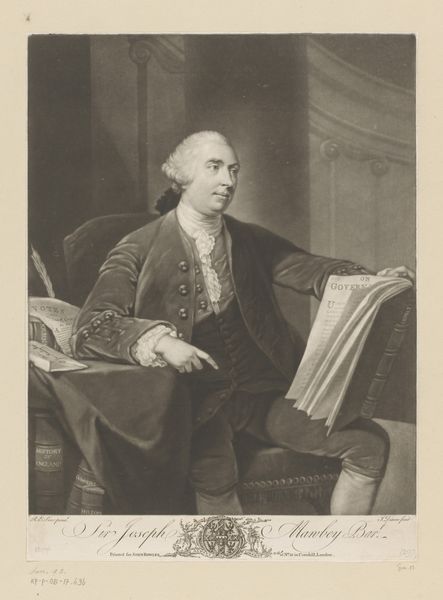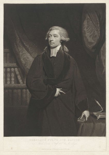 Editor: This is a rather stately engraving titled "Portrait of John Cooke," made in 1811 by Charles Turner. It definitely feels like a statement of power. The subject’s garb, his surroundings... It all projects authority. What strikes you most when you look at it? Curator: I immediately focus on the contrasts – the stark white wig against the dark, heavy robes. The symbolism of white representing purity, knowledge, enlightenment, set against the weighty cloak that hints at responsibility and perhaps the burdens of office. Do you see that tension? Editor: Yes, now that you mention it, it is definitely there. What else can you tell me about the symbols present? Curator: Consider the books slightly visible in the background. In Western iconography, books often signify learning, wisdom, and access to knowledge. And, given Cooke's profession, they hint at his connection to the legal world, reinforcing his authority. What feelings are evoked by this imagery? Editor: It’s an interesting juxtaposition – this rather grand display and then this little insight into scholarship and learning, which maybe brings the person a little bit more down to earth? Curator: Exactly! There is always a narrative, even in portraiture. I am drawn to understanding not only what’s represented, but why – what is Turner, the artist, communicating about Cooke, the man? The background evokes power while the symbols humanize him. Editor: So, it is trying to say something beyond just creating an image of what someone looked like? Curator: Precisely. Images carry weight and echo through history. What story will future generations read into this portrait? That’s the lingering question for me. Editor: This has really changed how I see the image, the deeper cultural meanings within what seemed to be just a straightforward depiction of an important man. Thank you!
