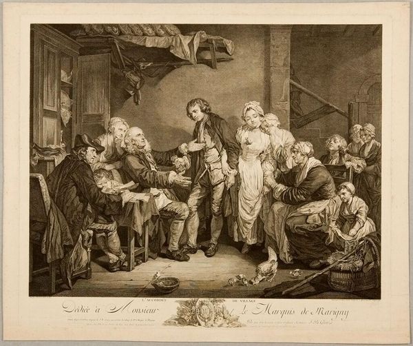 Editor: This is "The Paralytic Surrounded by his Children," a print by Jean Jacques Flipart. It feels incredibly intimate, like we're intruding on a very private, difficult moment. What stands out to you in this image? Curator: The image pulsates with symbolic weight. Notice how the figures cluster around the ailing patriarch. This huddling can represent the family unit, its inherent fragility and interdependence. Do you see any particular gestures that strike you? Editor: Well, the child offering something to the father seems significant, maybe a sign of familial duty? Curator: Precisely. It speaks to generational continuity, the passing of responsibility. This image also shows the burden of care that falls on the younger generation. The humble setting also suggests a universal experience. Editor: So it’s less about the specific family and more about the broader themes of sickness and family responsibility? Curator: Exactly. This print captures emotional truths through a visual language we still understand today. It is a reminder of how enduring human experiences are encoded in art. Editor: I see that now! The image really speaks to timeless human experiences.