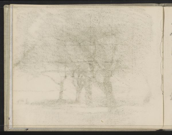 Curator: Welcome. We’re standing before Willem Witsen’s "Schemerlandschap," a charcoal drawing created sometime between 1870 and 1923, now residing here at the Rijksmuseum. Editor: Well, isn't that just the epitome of melancholy? I mean, look at that grey wash, the way it almost dissolves the trees into the mist. It's less of a landscape, and more of a mood study. Curator: Indeed. Witsen captures the atmospheric quality so well; he does seem to be evoking a particular emotional state with it, doesn't he? Charcoal was a perfect choice for capturing the nuances of light and shadow in a fleeting moment, it gives a weight and gravitas to something as transient as mist. Editor: Exactly! And I think the indistinct shapes contribute to that fleeting feel. You get this sense that the scene is slipping away even as you look at it. Maybe it's just my overly active imagination, but I sense this real lonely figure is sitting in a field in late autumn. Curator: That loneliness is really key, particularly as a reflection of its historical moment, I think. Landscape painting was becoming a place to process modernity, its alienation and distance, to work out one’s inner self. It echoes so many Romantic tropes in painting before it, using the landscape to suggest interiority. Editor: True, there's definitely echoes of Romanticism. But what sets it apart for me is this incredibly personal tone. It’s like a whispered secret. No grand pronouncements here, just quiet contemplation. I almost want to write a sad poem when looking at this work. Curator: I find that sense of personal feeling powerful. It suggests how the external world truly interacts with our internal one. What at first glance looks like a bleak picture, is actually layered with emotional complexities that can only be rendered through something with the tonal control and capacity for nuance of a medium like charcoal. Editor: Hmm, it makes me think about how even in moments of intense beauty, there's often a layer of melancholy that underlies it all. Life, love, landscapes even! Curator: Well said. Perhaps Witsen aimed to express exactly that subtle balance— the ephemeral nature of experience itself. A beautifully subdued piece. Editor: Yeah, and somehow it all just clicks into place and makes for this intimate scene which feels totally raw and emotionally revealing!