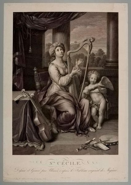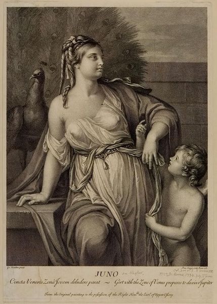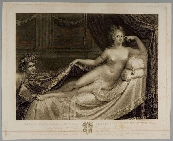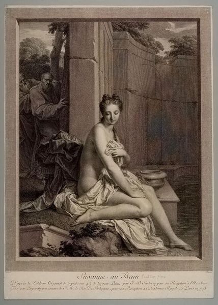 Curator: Ignazio Pavon's print, Susanna at Her Bath, presents a classic subject with striking use of light and shadow. The etching technique emphasizes textures, from the stone walls to the soft drapery. Editor: The gaze of the figure is noticeably downwards. The voyeuristic elders lurking in the background are disturbing. It creates a tension between vulnerability and exploitation. Curator: Yes, the story of Susanna is powerful. Throughout history, it has often been depicted to highlight themes of injustice and virtue. The elders represent temptation and moral corruption, casting a shadow over Susanna's innocence. Editor: It reflects how women’s bodies have historically been sites of control and judgement. Susanna is a figure caught between religious law and male desire, a dilemma that resonates even today. Curator: Indeed. The visual symbols here tie into broader narratives of purity, power, and the ever-present gaze. The artist used a historical story to create something deeply psychologically compelling. Editor: It certainly encourages us to reflect on the ongoing power dynamics at play in both art and society.