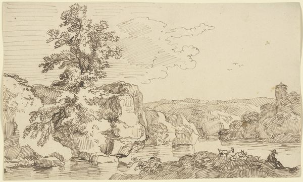 This landscape was etched by Franz Kobell in the late 18th century, presenting us with nature as both a serene vista and a stage for human contemplation. Consider the prominent rock formation, a motif echoing throughout art history, from the sacred mountains in Chinese landscape painting to the rugged cliffs romanticized by Caspar David Friedrich. Here, the rock is not merely a geological feature; it is a silent observer, a guardian of the landscape's secrets. Note the figures. Small. Insignificant almost, placed at the foot of the rock and in a boat on the river, accentuating the sublime, an emotional and psychological space. This echoes back to classical antiquity, where such natural features were often imbued with divine presence, a locus for nymphs and demigods. Over time, this reverence evolved, informing the Romantic era's fascination with nature's untamed power, a power that, though external, resonates deeply within the human psyche. The landscape, therefore, becomes a mirror reflecting our own inner wilderness, a reminder of the elemental forces shaping both the world around us and our very selves. The cycle continues.