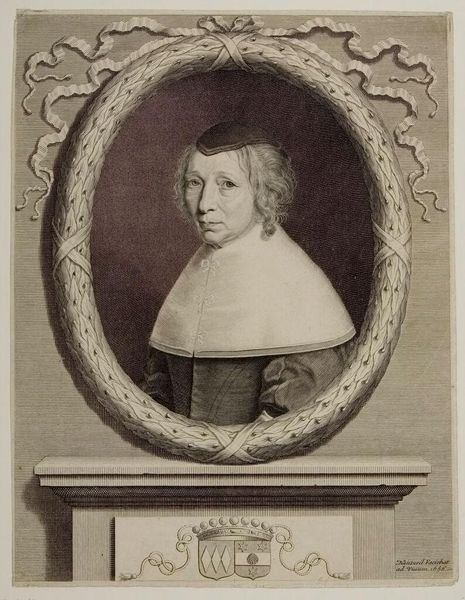 Curator: This is Jean Morin's portrait of Anne of Austria, Queen of France, in mourning dress. Editor: There's a certain somber elegance to this engraving. The tight frame, the dark attire, it speaks volumes about power and grief. Curator: Absolutely. Mourning dress was highly codified, a visual language of bereavement and status. Anne's garments denote not just personal loss, but a political statement regarding succession and her role as regent. Editor: The artist has captured the restrained emotion beautifully. The texture of the fabric, the delicate shading of her face...the symbols speak of duty and perhaps quiet defiance, don't you think? Curator: I agree. It reflects the complex role of women in power, particularly in a patriarchal society. This image encapsulates Anne's struggle for legitimacy. Editor: It makes you wonder about the woman beneath the symbols, the weight of expectation she carried. Curator: Indeed. It’s a powerful reminder of the intersections of personal sorrow and political maneuvering.