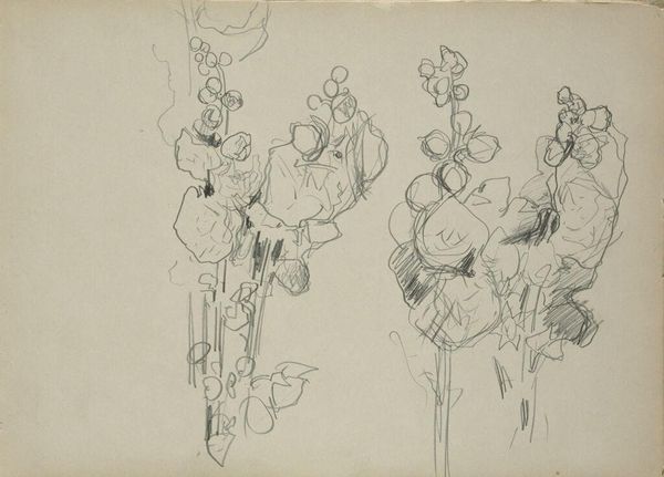 Curator: This is John Singer Sargent's "Sketch of Fig Branch; Sketch of Pomegranates," held here at the Harvard Art Museums. Editor: Delicate! It feels like a fleeting moment, captured with such simplicity. I find the composition wonderfully balanced. Curator: Sargent's choice of medium, likely graphite on paper, speaks to a pragmatic approach. It's a study, an exploration of form and light. These sketches likely served as preparatory work. Editor: Oh, absolutely. There's a sense of the artist’s hand, of observing and responding, almost improvising a language of form. It breathes, doesn't it? It's the raw gesture, the hint of volume, not labored over. Curator: His rapid notation reveals the artist's process, underlining the labour involved in rendering the material world. The paper becomes a site of production, a register of botanical forms. Editor: It invites us to be co-creators of beauty; the sketch becomes a bridge between Sargent’s vision and our own imagination, doesn't it? It really does. Curator: Indeed. I see this drawing as an instance of the artist's focus on the materiality of representation. Editor: And I think, "Ah, a reminder that beauty lies even in the simplest of observations, in the everyday!"