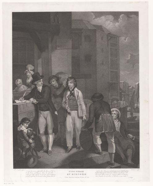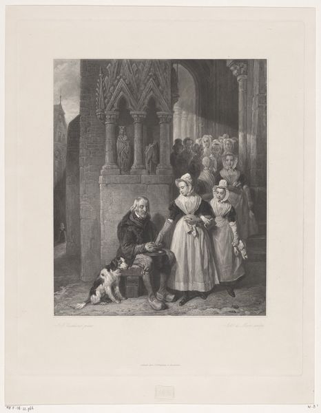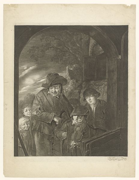 Editor: Here we have "Kijkkast," an 1823 engraving. It feels incredibly theatrical, like a stage set, doesn't it? What immediately jumps out at you about the visual arrangement here? Curator: The strategic employment of chiaroscuro guides the viewer's eye. Observe how the light source, presumably originating from the 'peep show' itself, illuminates the central figures, creating a focal point amidst the surrounding penumbra. Consider how this technique contributes to the overall compositional structure. What about the linearity of the arches, repeated in the scene, interests you? Editor: The arches do create a framing effect, a visual echo within the image. So you're saying that the interplay of light and shadow, alongside those linear forms, builds this sense of depth and perspective? Curator: Precisely. Note how the artist manipulates tonal gradations to suggest depth. Also, examine the interplay between the various subjects; do the figures establish a hierarchy? How does the artist use gesture and posture to convey meaning and emotional states? Editor: I see what you mean; the showman is centered and elevated, yet he shares attention with the generous giver, who directs focus onto the group of expectant children. How does focusing solely on the form avoid cultural background of this print? Curator: The form of the image embodies a visual commentary, using the language of shape, light, and arrangement, which supersedes its grounding context. This methodology is one mode of critical appreciation. Can you accept this? Editor: I see the validity in this approach and its usefulness for dissecting visual relationships. I feel I can use the intense darks and bright light to dissect the piece with purpose. Curator: A fitting summation. It seems a study of form has allowed a renewed understanding of the scene.