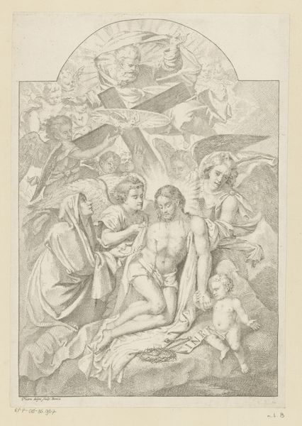 Giorgio Ghisi created this print, "Three Muses and a Putto with a Lyre," using the technique of engraving. This meant he had to use a tool called a burin to manually cut lines into a copper plate. The depth and density of these etched lines create the image you see; they hold the ink, which is then transferred to the paper under immense pressure in a printing press. Ghisi would have needed immense skill to create this image, including not just artistic ability, but also expertise in metallurgy. Consider the level of control required to achieve the subtle gradations of light and shadow. The whole process demanded patience, precision, and a deep understanding of materials, aligning it with the values of craft traditions. While prints like this were made in multiples, to spread artistic ideas, the labor involved reminds us of the intimate connection between art and the means of its production.