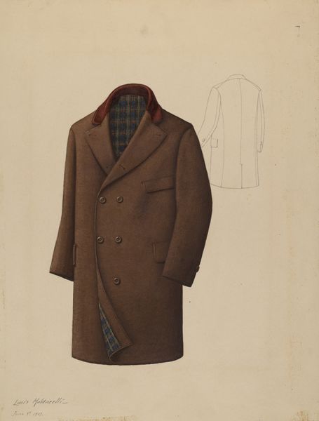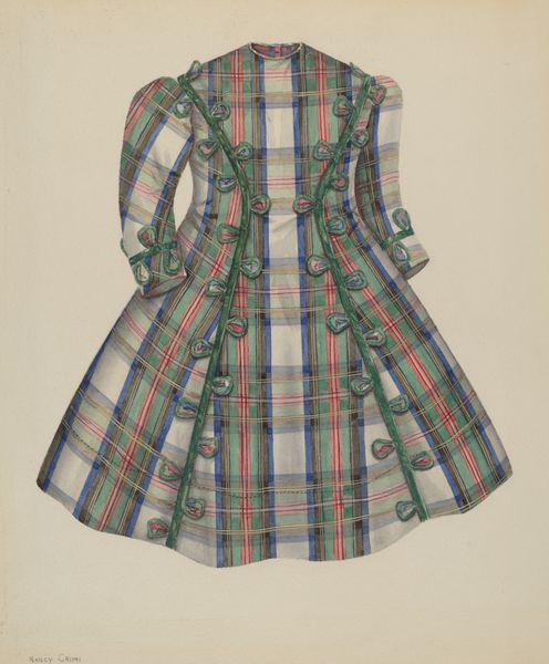 Editor: Here we have a colored pencil drawing of a Waistcoat, created sometime between 1935 and 1942. I’m struck by how flat the image feels, even though it depicts a three-dimensional object. It almost looks like a pattern more than clothing. What do you see in this piece? Curator: I observe a rigorous adherence to geometric form. The artist’s meticulous rendering of the plaid pattern establishes a complex network of horizontal and vertical lines, thus flattening depth. Note the colour choice: a carefully considered palette of browns, blues, and white reinforces the structural clarity of the plaid design, emphasizing its planar qualities. Do you notice any other flattening techniques? Editor: You're right about the colors! The values are really similar, so nothing pops out or recedes. And now that you mention the geometric shapes, I’m looking at how the shape of the waistcoat itself is almost like a rectangle with some curved edges. Is there a relationship between the flat style and the drawing being about clothing? Curator: Potentially. One can examine how the planar composition influences our reading of the object, perhaps causing the observer to view this garment less as a piece of apparel and more as a study in shape and texture. Do you think it removes it from being something functional and makes it just about the colors, lines, shapes? Editor: I think it does. It's like the drawing focuses on the abstract qualities of the waistcoat. It's been very enlightening to consider the composition separately from its function! Curator: Indeed, by reducing the garment to its fundamental components of colour and design, the artist presents an intriguing visual experience for contemplation.