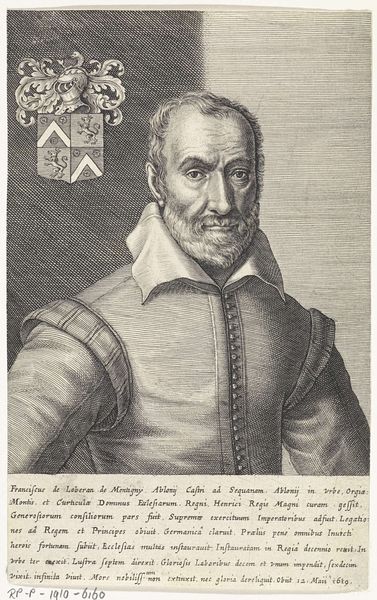 Curator: Let’s turn our attention to this engraving from 1610, "Portret van Paul Bril," by Hendrick Hondius I, which resides here at the Rijksmuseum. Editor: Well, immediately, I'm struck by the formality and intensity in the sitter’s expression. And the lines—so precise, capturing the textures of the ruff and the almost metallic gleam of the doublet. It really does suggest a careful process, right? Curator: Absolutely. This work is more than just a likeness; it’s a carefully constructed presentation of the artist Paul Bril and his cultural position. Notice the text at the bottom, praising his skill in depicting landscapes, his influence on the pontiff’s artworks and other patrons in Tyrio… It’s positioning him as a pivotal artist who appeals to the elite. We must remember that Bril made his name painting landscapes in Rome, effectively innovating and shifting what "landscape painting" could even mean during the Baroque period. Editor: The palette he holds so prominently really underlines that identity and artistic labor too, doesn’t it? Its inclusion also reminds the viewer about materials, pigments and other things Bril, a "landscape" painter, engaged with when depicting the land. And look at his dress. All those buttons – somebody made all of those – somebody probably stitched that whole thing by hand! Curator: Exactly. He is being displayed in conversation with labour. Moreover, consider the era’s religious tensions, the Reformation. Art becomes a powerful tool for asserting status and skill. These portraits did vital political work for their subjects, whose class power relied upon being able to commission artistic portrayals of this type. Editor: And thinking about the engraving process, we’re witnessing a transfer of skill, labor mediated through a plate and press, resulting in many impressions of the painting circulating, for a wider market maybe. It underscores this early-modern economy and artistic identity through craft and production. Curator: In the end, by recognizing these contextual details, we understand that this work signifies far more than just a representation. The print becomes an intriguing confluence of artistry, the social capital and economy surrounding the painter at the time. Editor: I agree. By attending to those factors of production, we see the image reveals layers about art-making in the Baroque Era in a tangible and compelling way.