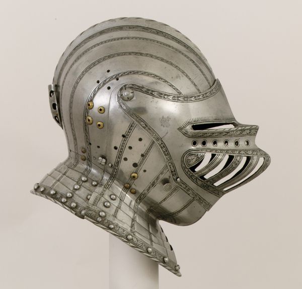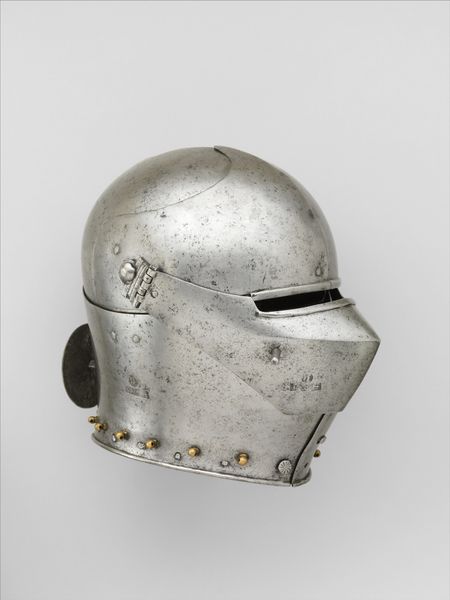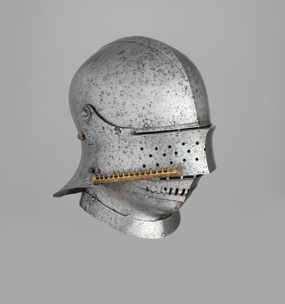 Editor: Here we have a "Closed Burgonet," made of metal by Kolman Helmschmid, sometime between 1500 and 1555. It's housed at the Met. Looking at it, I immediately think about restriction and protection, but there’s something elegant in the design, too. How do you interpret this piece? Curator: It's interesting you say "restriction." Consider the Burgonet not merely as protection, but as a symbol of power and status within a rigid, patriarchal hierarchy. What does it mean to encase the head, the seat of intellect and vision, in such a way? The holes for vision, almost like decorative crosses, are particularly evocative of the constraints imposed by religious doctrine and social expectations. Editor: So, it's not just about physical protection but also about social control? The decorative elements now seem less ornamental and more like signifiers of that control. Curator: Precisely. Consider the artistry involved – the craftsmanship elevates the Burgonet beyond mere utility. The identity of the wearer becomes subsumed within the armor, performatively constructing an image of invulnerability and authority that's intimately connected to gender, class and the theater of power in the medieval period. Who gets to wear this armor, and against whom, speaks volumes. Editor: It’s like the armor itself becomes a language. Thinking about who created it versus who wore it also introduces an interesting dynamic of power and labor. Curator: Exactly! The maker invests incredible skill and artistry, yet serves to enable the power of another. The question isn't just 'what does it protect?' but also, 'what does it perpetuate?' and, critically, 'who benefits?' Editor: This makes me look at the object in a completely different light. Curator: Armor, then, becomes more than just cold steel. It's a loaded object. One way to dismantle it is to question what that armour represented. Editor: I'll never see medieval armour the same way. It really opens your eyes to the layered social meanings embedded within historical objects.