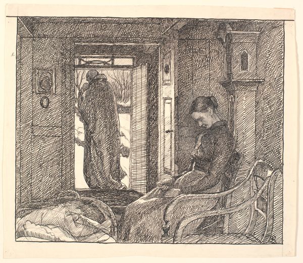 Curator: The overwhelming mood is somber, isn’t it? The grayscale tones immediately evoke a feeling of melancholy. Editor: Yes, it does, it feels like loneliness is in the room. What are we looking at exactly? Curator: This graphite drawing from 1932 is titled “Travelers #12”, and was created by Lucille Fink. She seems to depict a small carriage, filled with four solemn passengers. Editor: There's a tangible quality to the heavy lines. The artist seems to capture that cramped feeling on public transportation and how isolated we become as individuals in those spaces. Notice how the darkest marks surround the travelers looking out the window? The artist really wants to force that division. Curator: Indeed, the artist utilizes pencil to portray the confinement felt in traveling during the 1930s, particularly the socio-economic climate experienced in the depression era when access and space for transportation were often tightly restricted. And for certain groups more than others. I can see parallels between the shared but isolated nature of public transport now. The composition emphasizes the physical closeness of the figures while simultaneously underscoring their emotional distance. Editor: And the figures themselves--each is in their own little bubble. A man stares intensely, resting his elbow while seemingly caught in thought. To the side, the angle seems to portray another passenger avoiding attention, turned away from observation. The figures here feel compressed, even silenced, and there seems to be almost no breathing room between passengers. What about you? Curator: It's a haunting portrayal, this exploration of the transient experience of mobility; of shared, but fragmented community. It reminds me of being hyper-aware of personal space while traveling; this graphite artwork is more relevant than ever, with an expanded class-divided audience. Editor: Agreed. Fink really invites the viewer to reflect on the complex themes of isolation and shared experience—captured and expressed with the graphite itself. Curator: Yes, and the importance of situating her works within these larger political, socioeconomic conditions. Editor: The materiality and composition effectively converge, reinforcing these concepts, no doubt.