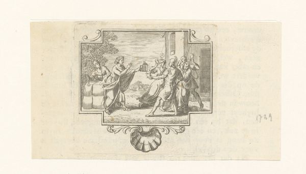 This is Cornelis Cort's "The Return of Jacob to Canaan", an engraving with a height of 132 mm and a width of 224 mm. The visual field is dominated by a procession of figures mounted on animals, an image teeming with the texture of fur, fabric and foliage. The monochrome palette invites a focus on the formal structure, most notably the composition and arrangement of figures within the constrained semi-circular space. Cort manipulates perspective to create an immersive scene. The semi-circular format, combined with the receding figures, creates a sense of depth, pulling the viewer into the biblical narrative. The engraver’s use of line is particularly striking. Hatching and cross-hatching are deployed to create tonal variations, defining the contours of the figures and animals and lending them a sculptural quality. The semiotic system here relies on established visual codes, where the act of returning signifies not just a physical journey but also a spiritual and cultural reclamation. Cort subtly destabilizes the notion of a singular return, suggesting that identity is continuously negotiated through movement and interaction. Cort's structured, formal approach presents a sophisticated meditation on the themes of return and transformation. It invites us to consider how these elements contribute to a more profound understanding of narrative and identity.