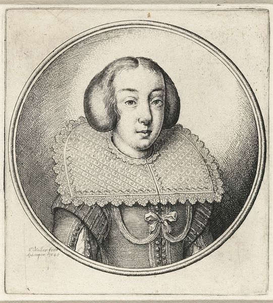 Curator: I'm immediately drawn to the delicate details, all achieved with lines, almost threadlike. It’s quite striking. Editor: Indeed. What we have here is a print, an engraving in fact, titled "Portret van Margaretha van Lotharingen" created sometime between 1644 and 1650, now held in the Rijksmuseum. The engraver was Pieter van Sompel. Curator: "Print." It is key to emphasize the medium. It impacts how the artwork functions. Its very purpose is circulation. Look at the framing; it mimics an oval picture frame, yet is crafted entirely from foliage. It reminds me of how prints made art available to a wider audience and suggests a democratizing force inherent in reproductive technologies. Editor: I think you hit a point there, but this work also highlights the hierarchical aspects of image production and dissemination. This is a portrait of nobility; its reproduction served to extend the reach and influence of that image, shaping public perception of power. Curator: Fair enough. And that’s heightened by the medium. Considering the labor involved in creating the original portrait, as well as the engraving process – the transfer of an image through skilled labor and specific material processes – the print becomes its own entity, carrying the aura of the subject and the process. The texture is fantastic too. Editor: I agree about the texture; Van Sompel employed hatching techniques beautifully. But considering its baroque aesthetic, what I see reflected most vividly is the fashion of the court in relation to statecraft: the pearl necklace and carefully arranged lace emphasize her position and contribute to the performance of power, if you will. Curator: So it functions almost like propaganda. Editor: Well, image management, definitely. The floral frame enhances it too, creating a sort of idyllic setting that suggests prosperity and divine right. This image isn't merely decorative; it participates in a much broader theater of dynastic display. Curator: Seeing how labor intersects with artistry in the engraving provides an additional lens. The engraver wasn’t just reproducing an image; he was also translating social status and power through the act of creation and distribution of material, to be handled, traded, looked upon. Editor: Absolutely, and thinking about the audience…those consuming such imagery reinforced certain values, aesthetic tastes, and socio-political norms of that time. The artwork served as both a record and a reinforcement of history. Curator: Fascinating. The complexities embedded within even seemingly straightforward portrait prints open pathways into labor, art history, and the social function of making things. Editor: Exactly. I always learn so much by digging into what portraits such as this signify culturally, generationally, and politically.