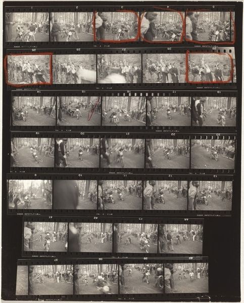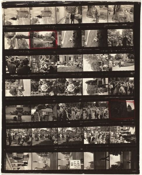 Robert Frank created "Convention 22" using photography. The overall arrangement presents a series of images in a celluloid strip, a format central to photography’s intrinsic nature. The stark contrast of black and white emphasizes texture and form, lending a documentary feel. The strip shows many images with gatherings of people, interspersed with intermediate pictures such as papers spread on a table, and a studio. These images, while appearing random, function as a visual language to convey ideas. The high-contrast presentation of these scenes, organized linearly, engages with semiotic systems, allowing viewers to interpret a range of meanings through their arrangement. The composition destabilizes conventional notions of narrative and challenges viewers to create their own narrative from its sequence of images. This approach underscores the idea that meaning is not fixed but is continuously constructed through the act of viewing and interpreting, transforming the photograph into a discourse on representation itself.