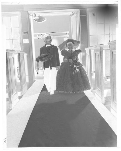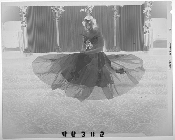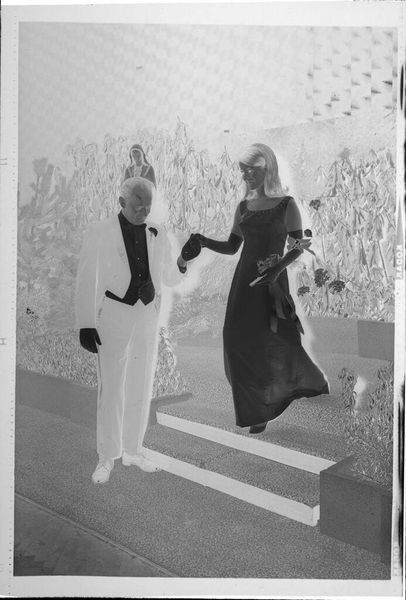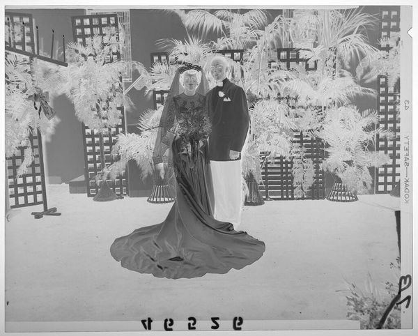 Curator: This photographic print, "Untitled (bride and father with glasses walking down wedding aisle)" by Martin Schweig, captures a wedding scene. It’s quite small, only about 4 by 5 inches. Editor: It feels… weighty, doesn't it? Even in monochrome, there's a density to the composition, a stillness that almost contradicts the forward motion. Curator: The inverted tones definitely add to that. The father, in what would have been a bright suit, becomes this looming, almost spectral figure. Editor: Exactly! And that inversion pulls focus to the materiality of the photograph itself. The grain, the imperfections… they become part of the story. It reminds us that this isn’t just a scene; it’s an artifact. Curator: It also throws into sharp relief the ritual aspect, but it is also very intimate. We’re both inside and outside of this moment, you know? Editor: Yes, and I think it’s lovely that a simple image can speak so profoundly about tradition, transition, and memory. A poignant meditation on family and ceremony.