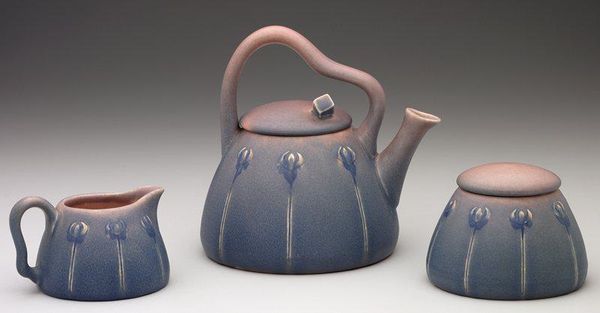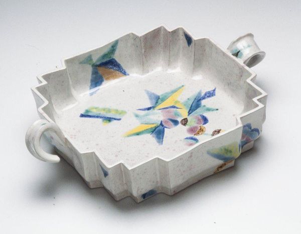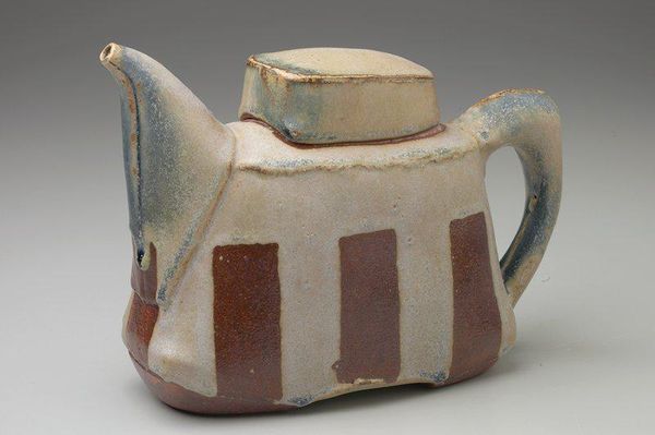 Editor: Right now, we're looking at Marleen Jack's "Sugar Bowl" from 1999. It’s made with ceramic and earthenware, and it’s currently held at the Minneapolis Institute of Art. I find the earthy tones and almost geometric shapes very calming. What is your first impression, and how would you interpret this work? Curator: Calm is a brilliant word. I see a dance between utility and form, something earthy and quiet. Jack wasn’t merely crafting functional objects; she was curating everyday experiences, wasn't she? There's an artfulness to this that goes beyond just holding sugar. I wonder, do you see any other geometric qualities that intrigue you? Editor: I think the sugar bowl itself, with its almost square shape but rounded edges, stands out in its deliberate design. It seems like the artist is trying to redefine how a functional object looks and feels. Curator: Absolutely. The glaze itself feels like a watercolour wash. I love that sense of quiet imperfection. Do you see how the lines suggest both organic forms and angular cuts? There’s this gentle tension between chaos and order. Almost wabi-sabi in its approach. Do you find that at all or am I making too much of it? Editor: No, not at all! That perfectly captures how it both references and contrasts with nature. Like a manipulated landscape contained on this tray. Curator: A manipulated landscape - yes, a microcosm! That helps explain what makes this unassuming object quite delightful. We can consider functional pottery a deep conversation. Editor: It does make you reconsider the artistry possible even in mundane objects. A refreshing idea. Curator: Indeed, the joy and sophistication are found in life’s simple things. Thank you, I really appreciate your comments today.