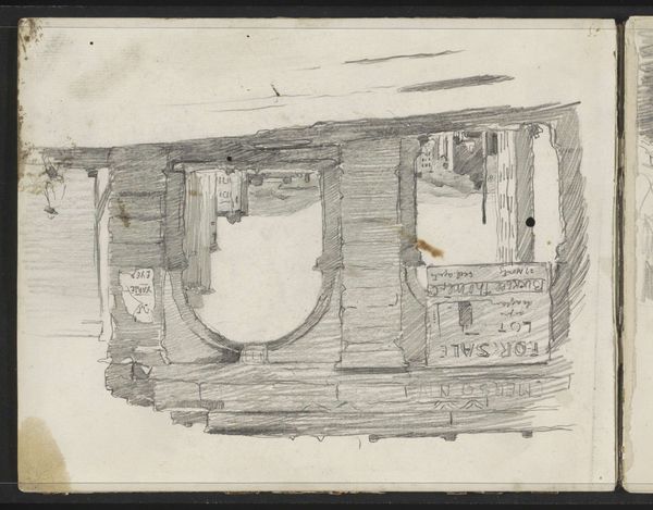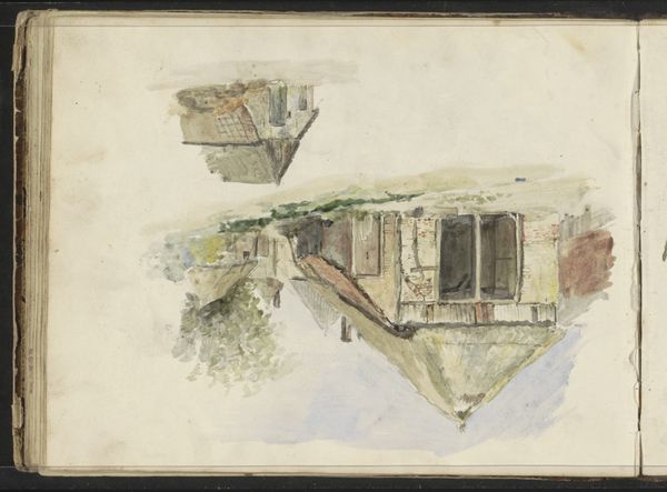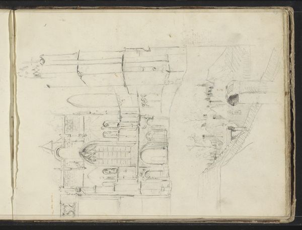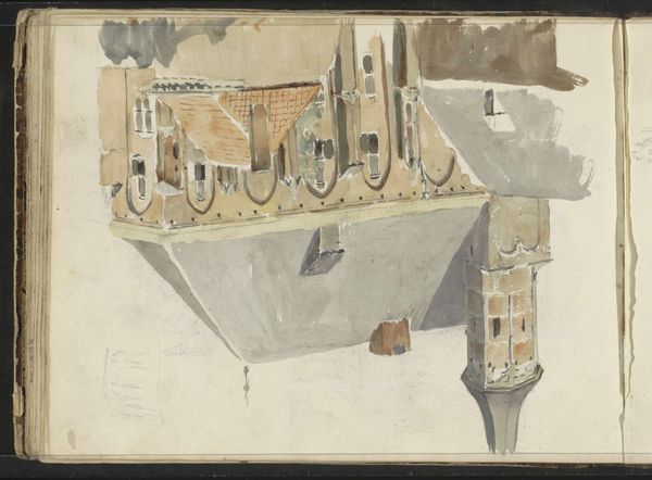 Editor: So, here we have "Gateway to a Courtyard and a Facade," a watercolor, pencil, and colored pencil drawing on paper, created sometime between 1822 and 1893 by Willem Troost. It has this dreamy, unfinished quality. The gateway kind of floats there. What strikes you when you look at it? Curator: It whispers of hidden histories, doesn’t it? That lone gateway, rendered in soft watercolors, is more than just a depiction of stone and mortar. It feels like a portal to memory, a fragile recollection of a place perhaps deeply cherished by the artist. Notice how Troost uses washes of color to evoke not just the architectural details but the very *feeling* of the place. Do you get a sense of intimacy despite the grand subject matter? Editor: Definitely. It’s not imposing. It's more like a personal glimpse. The drawing beside it seems almost like a rough draft, right? Curator: Exactly! Almost like a fleeting thought. What I find fascinating is the contrast between the almost photographic detail in the facade on the right, compared to the suggestive strokes forming the architectural draft to its left. What does this opposition suggest? A mind grappling with the tangible versus the ephemeral, perhaps? Editor: That makes sense. It’s like the artist is trying to capture both the reality and the impression of the scene. I was so focused on the dreaminess, I almost missed the detail. Curator: See how art pulls us into unexpected places? It is an exercise in expanding your way of seeing, too. Art asks us not just "what" we are looking at, but how we ourselves interpret. Editor: I get it! Looking at this piece has given me a whole new appreciation for the little things, the fleeting moments in cityscapes that are often overlooked.