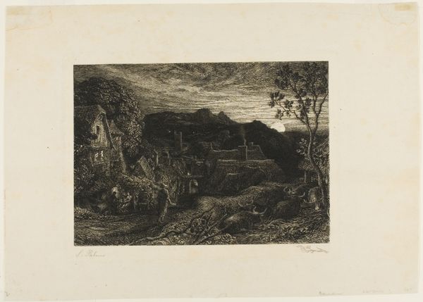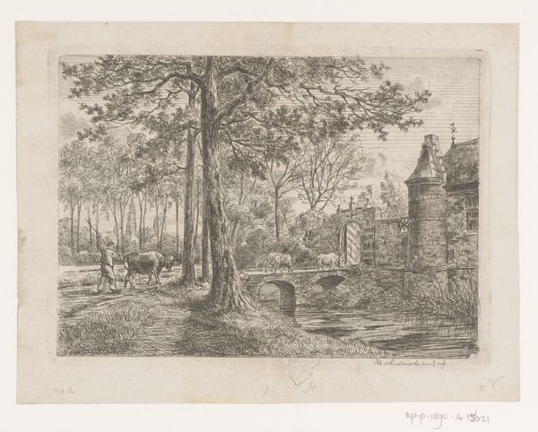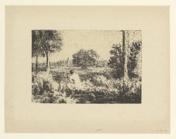 Editor: Here we have Willem de Zwart's etching, "Landscape with Man and Two Carts with Firewood," made around 1896-1897. The scene feels quiet, a rural stillness captured in the almost monochromatic print. What symbols do you see in this piece, and how do they inform the narrative? Curator: It's more than just a serene landscape. Consider the firewood—essential for survival, warmth, and cooking. In times of economic hardship, gathering wood becomes a potent symbol of resilience and resourcefulness. Do you see how the man with his cart becomes linked to themes of labor and perhaps even a struggle against the elements? Editor: Yes, it definitely shifts the mood. The scene becomes more weighted, less idyllic. So, the composition, the loaded carts contrasted with the empty sky... Curator: Precisely! Notice how de Zwart frames the carts against that vast sky. The etching medium allows for stark contrasts. Light becomes almost allegorical, illuminating the human effort against a backdrop of nature's immensity. The trees themselves, their gnarled forms, whisper stories of endurance and age. It is also Impressionist art. It hints more than spells. Editor: It is quite thought-provoking how the artist embeds cultural meanings into the scenery. The etching transforms the landscape from a mere backdrop into a complex arena of human endeavor. Do you feel it resonates in any specific way, considering our modern understanding of labour? Curator: Definitely. Even today, the symbol of a person working with their hands, providing basic needs, resonates with ideas about self-sufficiency and connection to the earth. There's an undeniable human connection here. We are no longer fully rural but find pleasure and self-sufficiency. Editor: That makes me think about our responsibility towards both environment and labour. I appreciate your perspective, drawing out so much cultural significance from this seemingly simple landscape! Curator: And you prompted a renewed view for me too! Thinking on the role of art in capturing not just scenes, but embedded values.