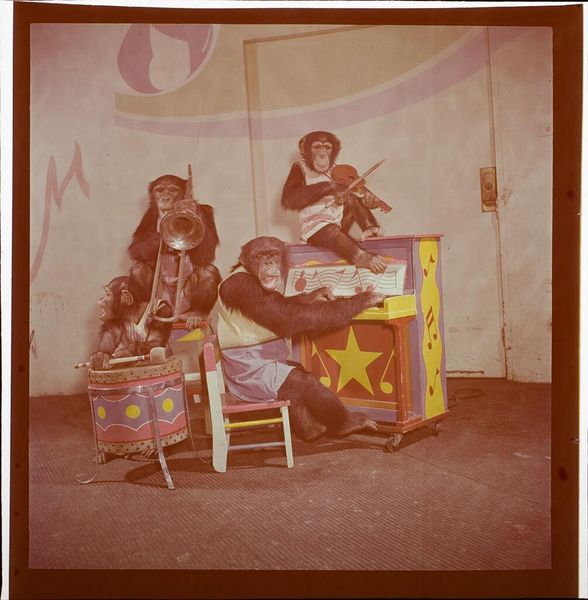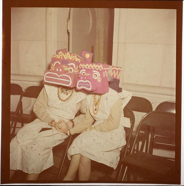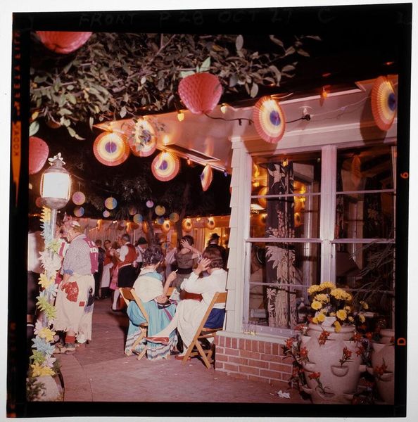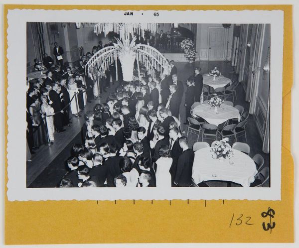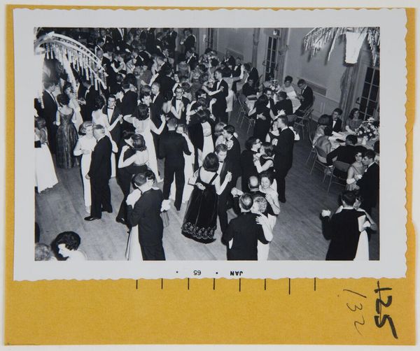 Curator: Jack Gould's small photograph, "Untitled (group of people in costumes at Beaux Arts Ball)," captures a moment frozen in time. The size of the print is just 6 x 6 centimeters. Editor: My first impression is one of discomfort; the costumes evoke a sense of appropriation, highlighting the complex layers of cultural representation. Curator: Indeed. The Beaux Arts Ball was known for its elaborate costumes, often drawing from diverse cultural references, but without the nuanced understanding necessary to avoid harmful stereotypes. Editor: The symbolic language on that painted backdrop—it feels like a flattened totem pole—is particularly jarring in its context. What meanings were being invoked, and perhaps more importantly, erased? Curator: Exactly. The image invites us to consider the politics of representation and the power dynamics inherent in costuming practices, prompting critical reflection on the gaze and its implications. Editor: These artifacts of social gatherings can be so revealing. The image serves as a stark reminder of past insensitivities and hopefully, a lens for more thoughtful engagement moving forward. Curator: I agree. It's a reminder that even seemingly innocuous images can reveal deep-seated cultural biases that demand continued examination.