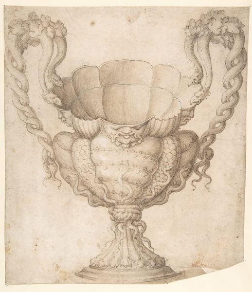 This drawing depicts a vase adorned with Pan, a faun, and a nymph, and is a copy of plate 14 from a suite designed by Saly in 1746. The artist remains anonymous. Rendered with delicate lines, the drawing captures the essence of classical design and mythology. The vase itself is intricately detailed, showcasing the artist's skill in replicating the original design. The choice of drawing as a medium invites us to consider the labor involved in creating such detailed ornamentation. Each stroke of the pencil contributes to the overall image, highlighting the artist's dedication to craft and precision. By copying Saly's original design, the artist engages with a tradition of artistic reproduction, reflecting the social and cultural values placed on classical aesthetics. This drawing serves as a testament to the enduring appeal of classical forms and the importance of craftsmanship in preserving and disseminating artistic ideas. It is a reminder that art is not only about individual expression but also about the transmission of cultural knowledge and the celebration of skilled labor.