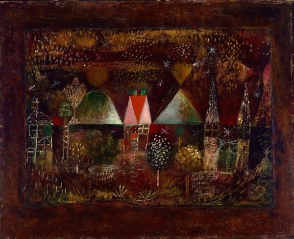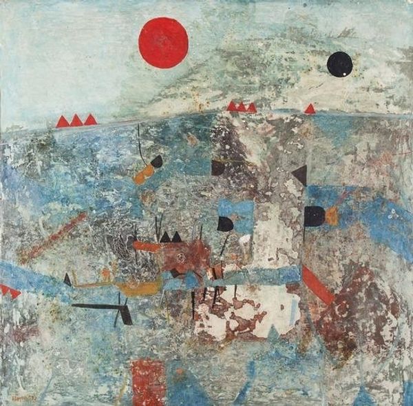Editor: Alice Rahon's "The Sky Above the City," created in 1945 with mixed media. There's a kind of melancholic mystery to it, don't you think? The geometric shapes float in a dusky atmosphere... It's giving me urban dreamscape. How do you interpret this work? Curator: It certainly is dreamlike! It pulls you into this floating, somewhat haunting space. The biomorphic shapes are really interesting juxtaposed with the angular architecture – is it a memory of a city? A feeling? Perhaps Rahon, known for her surrealist leanings and connection to poetry, saw cities as ever-changing emotional landscapes rather than solid structures? I wonder what story *you* feel the piece is telling? Editor: I get a sense of constant change...buildings, sky, emotions, everything flowing. Those linear outlines almost seem like memories struggling to hold it all together. It feels a bit unstable. Curator: Yes, the line work really accentuates that impermanence. Maybe she's inviting us to contemplate the relationship between external landscapes and internal states. Does it make you reflect on your relationship to a specific city, or to the concept of urban existence? Editor: Actually, it reminds me of a night I spent wandering in Mexico City, overwhelmed by the chaotic beauty and the feeling of being totally lost but exhilarated at the same time. Curator: Exactly! Perhaps Rahon wanted us to engage on such a deeply personal, visceral level. What began as an exploration of "The Sky Above the City" really does encourage each viewer to bring their own experience to it, as much, or maybe even more, than an art historical analysis. Editor: So it’s not just about what the artist put into it, but what *we* bring to it as well! Curator: Precisely! And hopefully you’ll bring that newfound perspective into the next gallery.