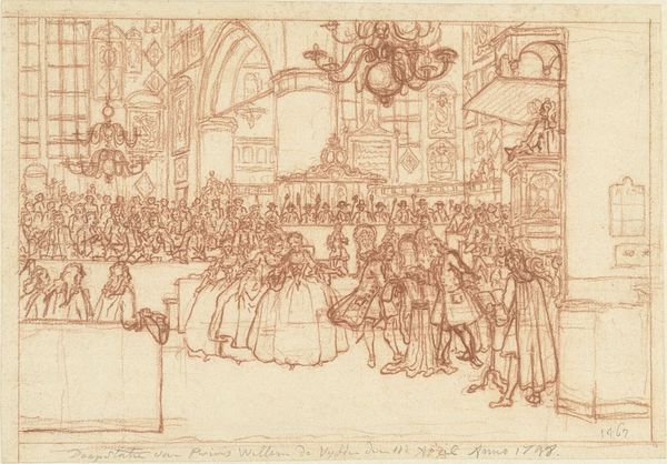 Simon Fokke created this pencil drawing, titled "Doop van prins Willem Frederik", in 1772. The artwork captures the baptism of Prince William Frederick, an event steeped in the traditions of the Dutch royal family. Fokke's drawing provides a glimpse into the rituals and social structures of the 18th century. The baptism was not only a religious sacrament but also a public declaration of the prince's identity and his place in the line of succession. Consider the weight of expectation placed upon this child, born into a world of inherited power and privilege, during a time of shifting political landscapes. As you look at this artwork, reflect on the complex interplay between personal identity and inherited roles. What emotions do you think the artist aimed to convey in this depiction of such a formal event?