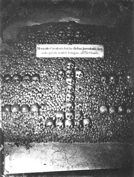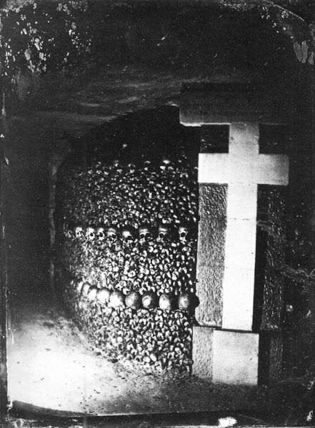 Editor: Right now, we're looking at Felix Nadar's "Catacombes de Paris" from 1861, a gelatin-silver print. Honestly, it's a bit unsettling, all those skulls stacked up! What do you make of its stark, almost confrontational composition? Curator: Unsettling is a kind way to put it, isn’t it? Nadar, bless his morbid heart, was after something beyond the purely documentary. This was one of the first instances of using artificial light in photography underground. Before this, you would think documenting the catacombs in Paris wasn't possible. Nadar created this image with magnesium flares which really speaks to the human drive for uncovering the unseen. Editor: So, it’s partly about the tech as well as the subject? That’s not something I considered at first. Curator: Oh absolutely. But the photograph does something more—it is the story of death. The composition of the image and darkness alludes to a conversation with the viewer of their mortality. Even Nadar's bravado doesn't quite disguise the palpable weight of history, the… whisper of what it means to truly vanish. It’s not just about the space, but about the echoes within it. What whispers do you hear? Editor: Well, thinking about it that way, I suppose it moves past just being shocking imagery into something a little deeper… something about facing our own end. Curator: Precisely. And isn't it curious how a photograph from so long ago can still strike such a chord today? We still carry those whispers with us. Editor: Yeah, it's amazing how much a little context can change everything. I will never look at death the same!