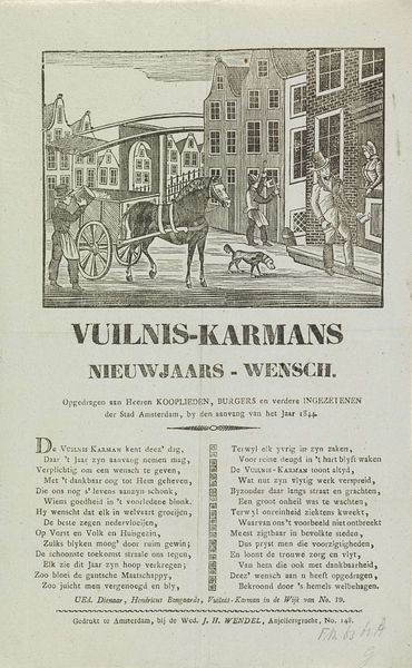 This is a new year's wish from the Amsterdam ash carters for 1845, printed in Amsterdam. These ash carters, or "asch-karmannen," occupied a distinct, and often stigmatized, position in Amsterdam's society. The print offers a glimpse into the complex social fabric of the city, where class distinctions were deeply entrenched. The poem inscribed in the print reveals their hopes for the new year: "May God grant us his favor." It speaks to a desire for divine grace and prosperity, reflecting the precarity of their occupation. The image also portrays the carters interacting with the residents. This exchange underscores the interdependence between different social strata. It gives the carters a face and a voice, while challenging the prevailing negative stereotypes of the time. This print is a poignant reminder of the lives and labors of the asch-karmannen, who toiled in the shadows to keep Amsterdam clean.