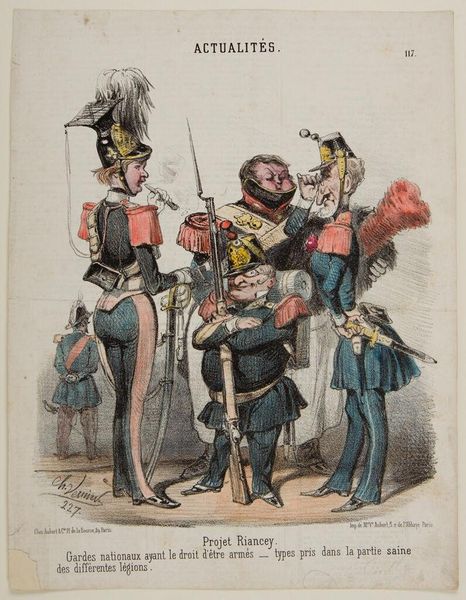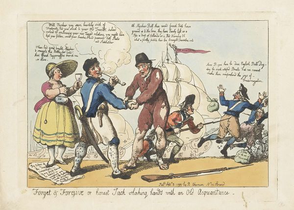 Editor: We're looking at "Napoleon wordt geschoren, 1813", possibly from 1813. It's an engraving now housed at the Rijksmuseum. It's… quite busy. It depicts several figures shaving Napoleon, or at least someone who appears to be him. The figures are positioned within what is captioned “The Allies Shaving Shop”. What strikes you most about this composition? Curator: The piece’s effectiveness lies in its dynamic composition. Notice the strong diagonal lines created by the figures' arms and shaving implements, which draw the eye towards the central figure of Napoleon. The swirling soap suds almost threaten to obscure the main subject and provide an odd aesthetic. Do you observe a conscious organization here? Editor: It almost feels chaotic, but the composition centers around Napoleon. It makes the point of the shaving. Is it just me, or are some of the lines rather caricatural? Curator: Indeed. The exaggerated features and gestures serve to amplify the satirical message. This also brings to mind some art and philosophical schools of thought such as mimetic theory and even the study of rhetoric. Note the textual additions – do you notice how the inscriptions function as a structural tool to communicate the artwork's central argument? Editor: Yes! “Prussia, Russia, Sweden & Co, shavers in general, To Nap Boney and the Grand Army." Also: “Holland." Those word placements definitely augment meaning, even to a novice. Curator: Precisely! Moreover, how does the artist utilize contrasting values to distinguish figures and convey the emotional intensity of the moment? Editor: I suppose that's the dark and light... I see a clear delineation! Overall, it's more intricate than it seemed. Seeing how you analyze the elements shows a layer of deliberate arrangement that contributes so much more than just first appearances. Curator: Indeed, by dissecting the visual components, we uncover layers of meaning embedded within. We've learned how formal elements contribute to this engraving’s power.