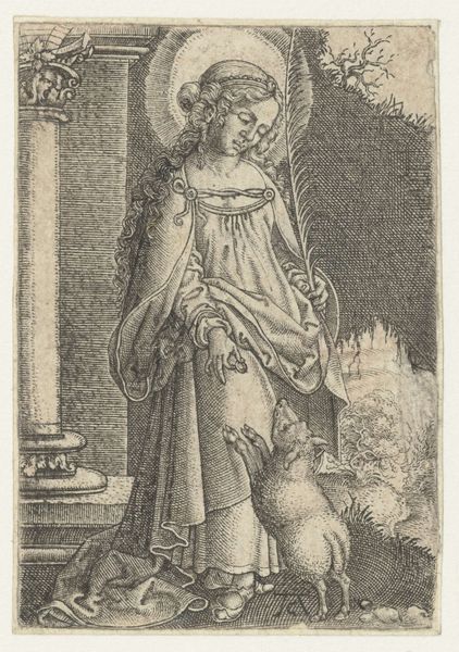 Curator: Looking at this engraving, “Heilige Catharina,” or “Saint Catherine,” we see an iconic representation of a medieval saint, attributed to the hand of Monogrammist AC from sometime between 1520 and 1562. The print is held here at the Rijksmuseum. Editor: My immediate reaction is that she appears surprisingly composed, given what I know of Saint Catherine’s story. The intricacy of the lines suggests a dense, detailed narrative, but her expression is so serene. Curator: Absolutely. That serenity is part of the carefully constructed iconography. Note the halo, the sword, and the book at her side—these are potent symbols. The sword represents her martyrdom, of course, and the book signifies her wisdom and learning. These emblems anchor her identity within a visual language understood by the audience. Editor: It’s fascinating how these objects coalesce to create meaning. The presence of the sword suggests violence and defiance, but the book, and more importantly her gaze, redirect our attention to intellectual strength. What does her elaborate headdress signify within this context? It feels intentionally emphasized. Curator: I think you are right to question that, it does more than merely communicate the context of the 16th Century Northern Renaissance! As a halo draws our eye to her divine and spiritual nature, so the very ornate, elevated head-piece suggests an elevation of status or place in society. Consider that within cultural memory and history, Saint Catherine was of noble descent. Editor: So, we have an aristocratic woman, but what are we to make of the print medium itself? It isn’t just an image, it’s an accessible object that democratized visual storytelling and would’ve placed it within the public sphere. How did these accessible depictions reshape her popular image? Curator: Mass production allowed this version of Catherine and all she represented to be disseminated to many. These symbols become amplified as people interpret her values and virtues as a result. So by seeing this repeatedly over time and geography we begin to see, collectively, shared human truths. Editor: That is really thought-provoking! So it isn't only about artistic creation, but the diffusion of social power by distributing archetypes within reach of the many. This makes one consider what "Heilige Catharina" signified across temporal and socio-economic circumstances when more people can access what it suggests! Curator: Exactly. And looking at it now, through that lens, helps us see her relevance today, not just as a religious figure, but as a symbol of resistance, knowledge, and power available to anyone!