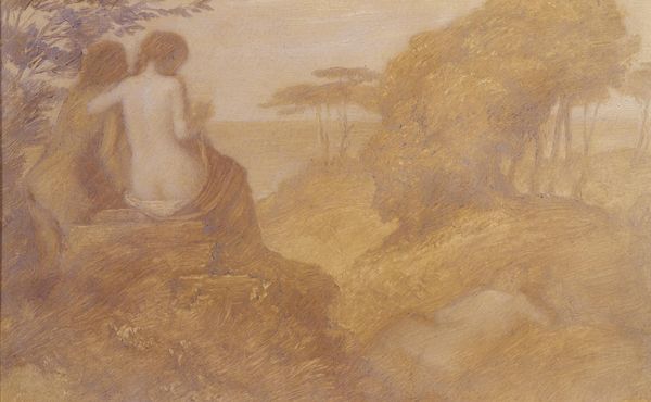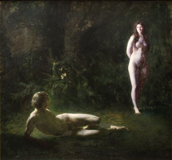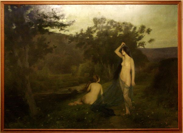 Editor: This is Jean-Jacques Henner's "Naïades," created between 1873 and 1877 using oil paint. I'm struck by how earthy it feels. It's almost like the figures are emerging directly from the soil itself. What strikes you most about it? Curator: It's precisely that earthiness, that raw materiality, that fascinates me. Look at the paint application: thick, almost sculptural in places. It emphasizes the physical act of creation, the artist wrestling with his materials to conjure these figures. Do you think about how the pigment itself was sourced and ground? Editor: That’s interesting. I hadn’t really considered the materiality of the paint itself. Is that important to how we understand the work? Curator: Absolutely. Henner is working within the established academic tradition of nude painting, but this rendering feels deliberately less polished, less idealized. Consider the conditions in which he was creating, the rising industrialization of art supply production. How does that inform the almost primitive feel of the painting? Editor: So, you're suggesting he's responding to industrial production by emphasizing handcraft and raw materials? Curator: Exactly. The act of painting, the materiality, becomes a statement in itself. We are looking at not just figures but also the evidence of labour. He seems to question the distance between labor and art by doing this. Look at how figures emerge organically; it's as though he is suggesting that the water nymphs arise naturally. Editor: That gives me a whole new way of looking at it! I was so focused on the mythology that I missed the commentary on production and value. Curator: Indeed. By considering the processes, labor, and materials behind the creation, we challenge traditional hierarchies that separate fine art from other forms of making and unearth other layers of meaning embedded in art.