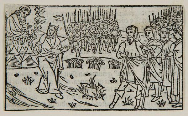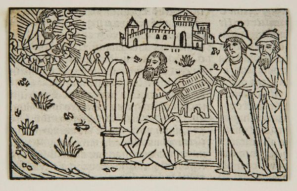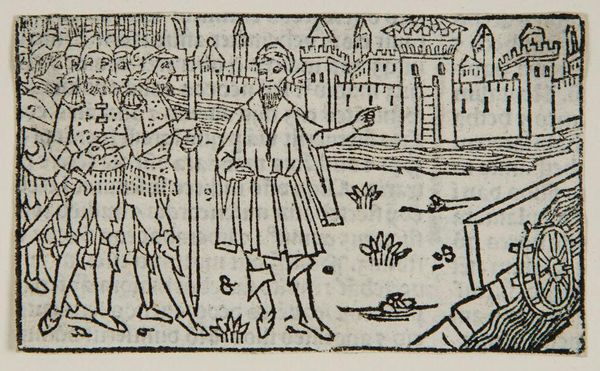 Editor: This black and white print, "Illustration I," by an anonymous artist, presents a scene filled with figures and architectural elements. It has a rather somber tone, doesn't it? What do you see in this piece? Curator: The iconography strikes me immediately. The figures surrounding the deceased, the king pointing, the river scene… They speak of morality, judgment, and potentially divine intervention. The river could represent cleansing, or perhaps the boundary between worlds. Does that resonate with you? Editor: I hadn't considered the river as a boundary. So, the artist is using these recurring symbols to tell a larger story about mortality, even justice? Curator: Precisely! These visual motifs were a language understood by many. Recognizing these patterns helps us unlock a deeper understanding of the intended message. Editor: That’s a great point about visual motifs. It makes me consider the audience and their expectations for the illustration. Curator: Indeed. The symbolic realm offers endless interpretations.