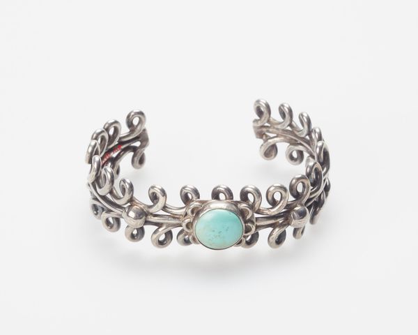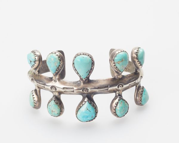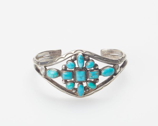 Curator: Here we have a Navajo bracelet, likely made around 1950, composed of silver and inlaid with beautiful turquoise stones. It has such a cool vintage look. What strikes you about this piece? Editor: I'm drawn to the arrangement of the stones, and the texture of the silver—it’s obviously handmade. It feels quite different from a lot of mass-produced jewelry. How does the construction affect its cultural significance? Curator: That’s a crucial observation! Thinking materialistically, consider the source of the silver itself. What did the Navajo, or Diné, have to do to acquire and transform it? This wasn’t some readily available material. And what about the turquoise, often traded across vast distances? Editor: So, it’s not just about the aesthetics but the whole network of extraction, labor, and exchange that brought the materials together? Curator: Exactly! It is all about these networks. The hammering and shaping of the silver, the setting of the stones, each step reflects labor, skill, and, importantly, a relationship to resources often dictated by colonial power structures. The stones aren't just decoration, they are carriers of cultural meanings. Think about trade and access to tools, which all factor into the final product. Editor: I hadn't considered it that way. Now, I’m wondering about the market this bracelet was intended for, who would buy and wear this? Curator: Good question. By 1950, the market for Navajo jewelry had shifted from primarily internal use to a booming tourist trade. This meant adjusting designs, speeding up production, and navigating a complex relationship with traders who controlled access to materials and markets. It's not just "art," it’s evidence of cultural adaptation and economic negotiation. Editor: That's so fascinating, viewing this piece through the lens of material culture and the economic realities of its production changes everything. I’ll never look at a piece of jewelry the same way. Curator: Indeed, seeing art through the lens of materials and labor reveals a much richer story. We must think beyond just the aesthetic impression, which tells you a great deal about cultural values and historical trade and labor relationships.