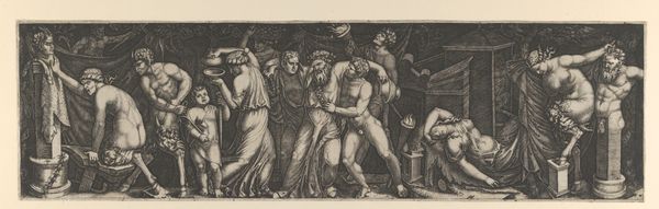 Editor: This engraving, "Bacchanaal met dronken Bacchus en saters en maeneaden," by Marcantonio Raimondi, dates from the 1510s or 20s. It's incredibly detailed, a wild scene! I'm curious about the context of its creation; what story do you think this print is trying to tell, especially considering its historical moment? Curator: That's a fantastic question. Remember, prints like these were crucial for disseminating artistic ideas across Europe. Raimondi, while a master engraver, wasn’t inventing the scene. This image echoes the revived interest in classical antiquity that was so important for the Italian Renaissance. We see a revelry dedicated to Bacchus, or Dionysus, but it's more than just drunken fun. It's also about exploring ideas of ecstasy, ritual, and even a kind of unbridled freedom—concepts that resonated powerfully, and often provocatively, with Renaissance audiences and artistic circles. Do you notice how the bodies are rendered? Editor: Absolutely, they seem very classical, idealized even. It is hard not to consider what this all signifies, if anything, for the artist himself, especially at that period. Curator: Precisely! It's unlikely Raimondi experienced a Bacchic revelry himself! What we are looking at here is largely mediated. Renaissance art was deeply enmeshed within circles of patronage, collecting and increasingly complex social stratification. Consider this print as a product created not from some authentic revelatory experience but instead as a knowing engagement, steeped within artistic tradition that circulated among elite audiences and helped in reinforcing their prestige, status and privilege. So, this seemingly “free” bacchanal reinforces rather conservative cultural patterns. Editor: That’s fascinating! So it’s less about personal expression and more about participating in, and perpetuating, a particular cultural narrative. That provides such a helpful perspective. Curator: Exactly. By understanding the socio-political forces at play, we move beyond simply admiring the technical skill and delve into the power dynamics that shaped even seemingly innocent images like this one. Editor: Thanks, that makes me think about it in a completely new light! Curator: Indeed, seeing art within its historical framework provides a richer understanding. It highlights the artist’s own world, the culture of patronage, the development of distribution of imagery to broader audiences and of course Renaissance's dialogue with classical ideals.