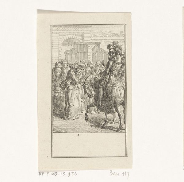 Editor: So, here we have Johannes Steyn's "Funeral Procession with the Body of Saladin," created around 1836. It’s a pencil and ink drawing. It gives me the impression of a historical record, something meticulously rendered but maybe a bit stiff in its emotion. What do you see in this piece? Curator: I see the weight of history rendered in careful lines. Consider the figure of Saladin himself. Even in death, being carried aloft, what symbolic power does he still represent? Think about what Saladin means to both Islamic and Christian cultures - a figure of respect, even admiration, despite being an adversary. Editor: That’s fascinating. I hadn't really considered Saladin's specific role. Is Steyn then trying to convey that duality through the procession? Curator: Precisely. Processions themselves are laden with symbolic weight. The act of carrying a body in this way – look at how many figures are present, the banners held high, and the very deliberate pacing of the figures in the front row, and how all of this serves to perpetuate the legacy and, dare I say, myth of the individual. Editor: I notice that it’s also a very linear image; everything seems very carefully outlined, like an engraving. Is there significance in that? Curator: The linework gives a sense of precision, almost legal documentation. The artist immortalizes the procession. In doing so, do you notice the expressions and garbs? Editor: Yes, the figures' faces look stoic but they show sorrowful expressions, which speaks to the complexity of human reactions. I suppose Steyn is demonstrating an iconic historical image for people to reflect upon his significance as both a leader and historical personality. Thank you. Curator: Indeed. Art can be powerful. The echoes of the past still resound through imagery, inviting continuous discussion.