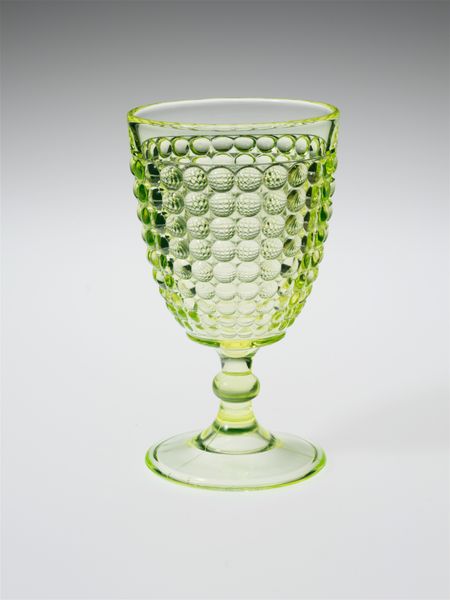 Curator: This elegant piece before us, crafted by Adams and Company between 1870 and 1890, is simply titled "Wine Glass". The glasswork is a refreshing study in simplicity, currently residing here at the Metropolitan Museum of Art. Editor: Oh, my, isn’t it delightful? The pale green hue and those raised circular details all over…it's utterly charming. Almost feels like something from a fairy tale. Curator: Adams and Company were key figures in the American glass industry at that time, contributing significantly to the decorative arts movement and the democratization of refined aesthetics. These pressed glass pieces made elegance accessible. Editor: Those small, textured circles immediately bring to mind clusters of grapes, fitting for a wine glass, no? And that delicate green, so like new vine growth, a hint of spring… such resonant imagery. Curator: Exactly, although the precise intention might be hard to recover. I find it fascinating how objects like these enter everyday life, becoming part of cultural memory without necessarily being ‘high’ art, yet so many households owned something just like this, setting tables, staging parties, celebrating milestones. Editor: Oh, definitely, it represents the rise of accessible beauty, of affordable style. Those circular motifs may even evoke the abundance and conviviality associated with wine itself—celebration and friendship in a glass. The color too would have appealed to a broad swathe of Americans Curator: Though practical and replicable thanks to industrial methods, there’s an artistry in the subtle proportions and pleasing design; and it speaks to a new consumer culture. It’s quite satisfying to consider how everyday objects carry meaning beyond just their function. Editor: Yes! It seems such a simple piece, yet that evocative green speaks of hope, while the raised designs offer an almost tactile invitation. I like knowing this cup holds memories, dreams of generations past. Curator: Indeed, and considering it, even today, encourages us to think about art's place within our lives and the subtle visual language we consume constantly. Editor: A toast, then, to that ongoing conversation with beauty.