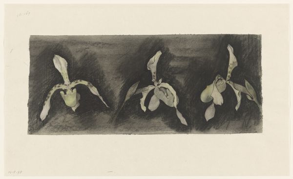 Curator: Sidney Nolan’s “Print 8,” held here at the Tate, offers this somewhat brooding meditation on flora. I'm immediately struck by its somber mood. What is your first impression? Editor: Death, actually. There's something about those wilting petals, and the harsh, almost violent brushstrokes in the background, that suggests a vanitas still life. Curator: Interesting. For me, the flowers evoke more personal symbols of resilience and quiet beauty, pushing up through what could be the muck of life. The brushstrokes might reflect chaotic internal thoughts. Editor: I see the internal chaos, too. The flowers, though, their whiteness against that darkness is a traditional symbol of purity confronting corruption. Perhaps a reflection on the transience of beauty? Curator: Maybe so. It is good to remember that Nolan’s paintings contain hidden depths. This could be a beautiful yet painful, exploration of the contrast between nature and human darkness. Editor: Yes, and perhaps how those two are always intertwined, in our memory, in our culture, in the very symbols we use.