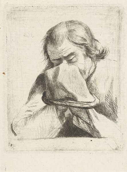 Curator: This is Paul-Albert Besnard's 1898 etching, "Madame Aman Jean." Editor: My goodness, the mood! She looks absolutely lost in thought, like she's about to unlock some hidden dimension of the universe. There's a quiet drama in the way the shadows play across her face. Curator: That drama is palpable. We can see Besnard employs etching, a printmaking technique using acid to create recessed lines in a metal plate. In this portrait, that method certainly enhances the intimate, symbolic nature of the piece, situating Madame Aman Jean as both a subject of observation and a symbolic figure of reflection. Editor: It’s interesting that you bring up "intimate". I am immediately struck by her gaze and posture, like I'm peering into her private moment. The circular composition seems to hug her close, cocooning her from the outside world, or perhaps imprisoning her, which adds another layer of mystery. It's raw. Curator: Symbolism certainly is layered here. There is tension between the overt aesthetic beauty typical of portraiture and what could also be read as an exploration of interiority. By depicting his subject shrouded, veiled in shadows, the work creates space for interpretations connected to the limitations placed on women and their intellectual or creative freedom at the time. It begs questions of visibility and agency. Editor: Visibility and agency are good ways to describe what’s happening here! Looking at her closely, I almost get a sense that she is aware of being looked at—judged, even. I find myself wondering if that’s why the shadows linger and obscure. Are we really seeing her? Or just a projection? I almost feel complicit by merely observing. Curator: Besnard presents a complexity inherent to portraiture. Here is a woman as subject and object, complicated by class, expectations, and perhaps artistic intention. The portrait as a lens for social commentary. Editor: It makes me appreciate art even more; you know, that moment when technique meets truth in a way that hits you right in the gut? I love that feeling, and this etching definitely stirs something profound. Curator: It invites consideration of how portraits from this period not only represent individuals, but also serve as points of access for broader social, political, and gendered dialogues, which continues to resonate today. Editor: Yes, what a powerful moment captured, sparking all of these questions and perspectives! I feel like I could stare at this portrait for hours.